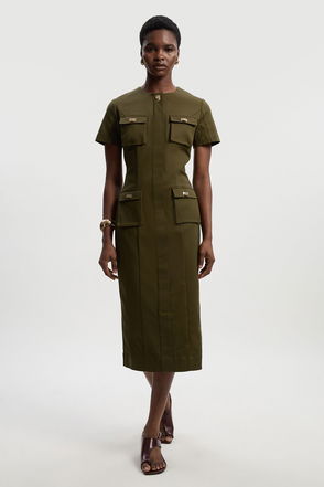 Feel elegant in our midi dress, featuring a figure hugging silhouette, an asymmetric neckline, and zip detailing across the entire piece. Style this dress with strappy heels for an outfit that will turn heads from party nights to upcoming occasions and events.