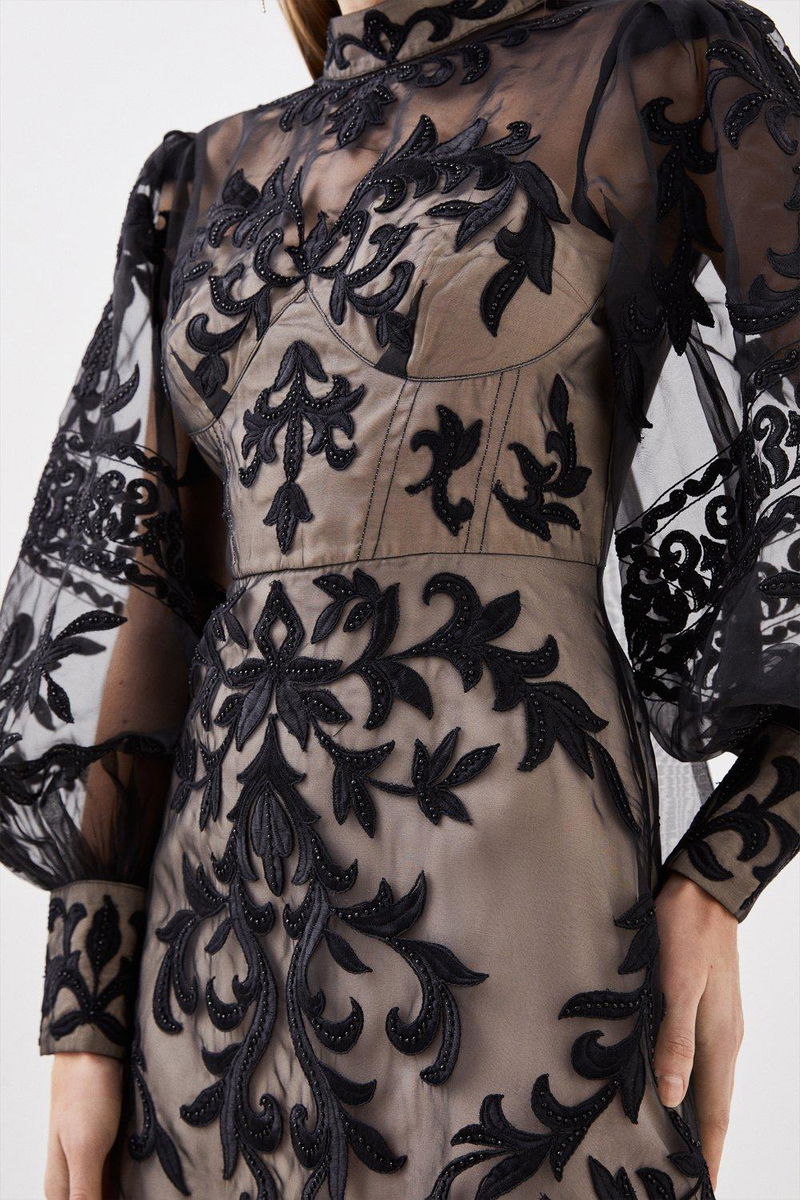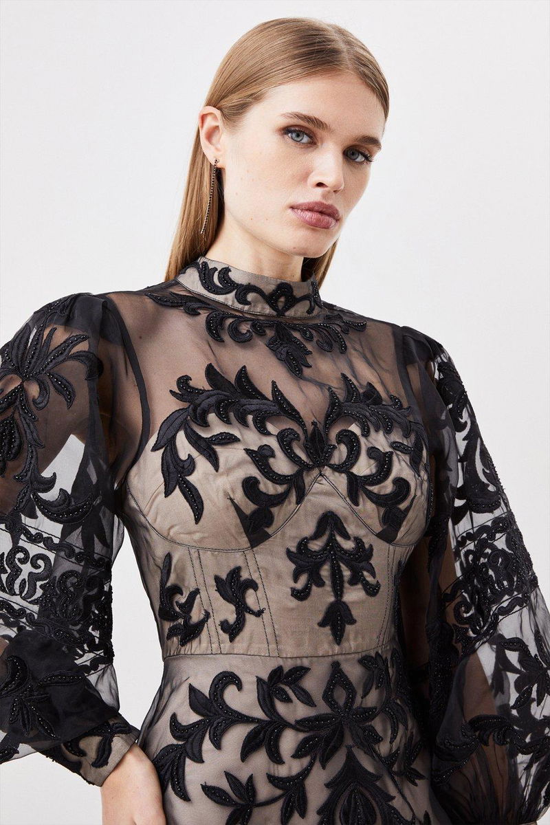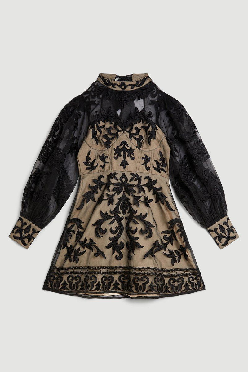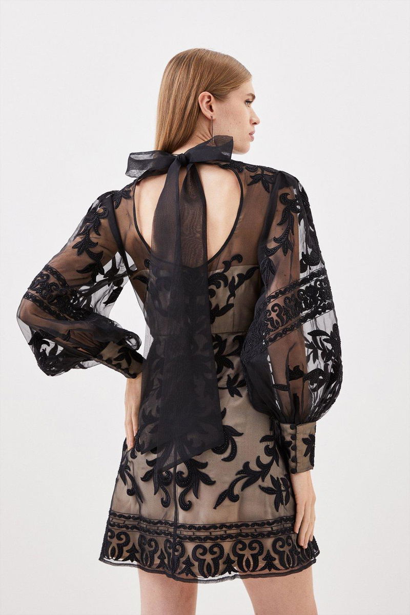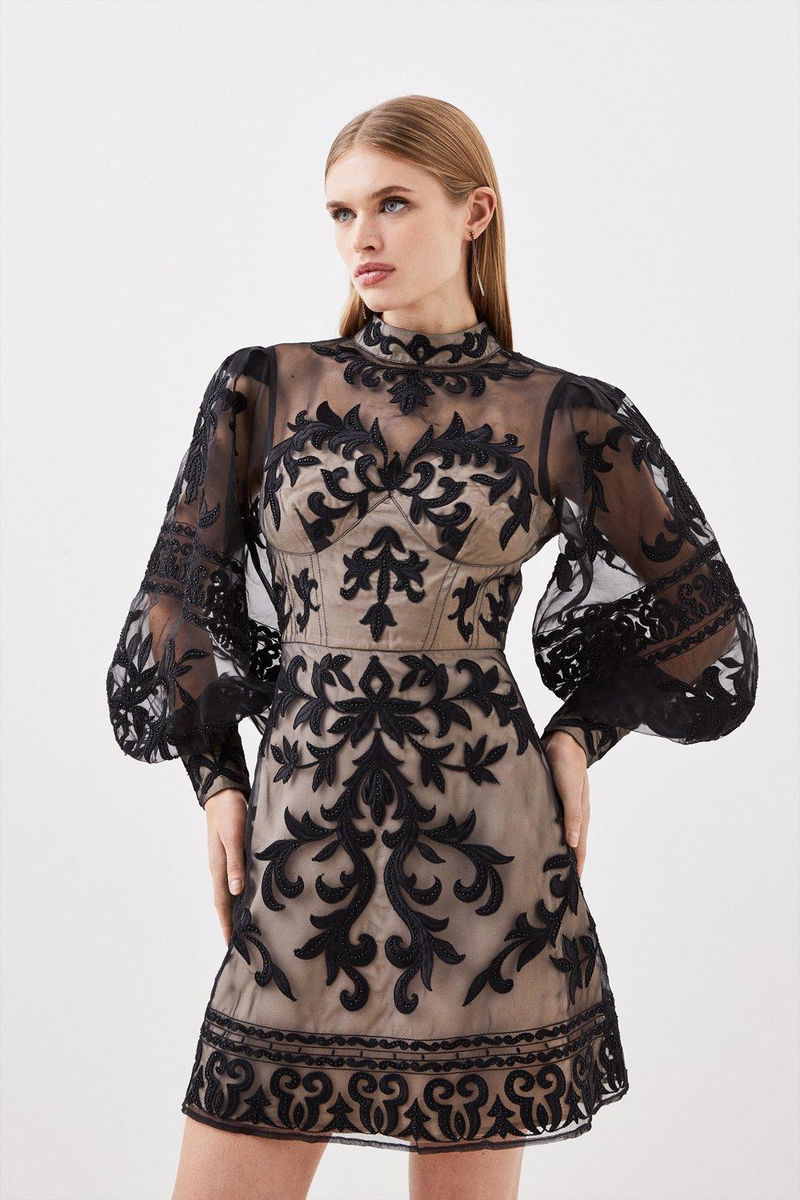 Exude artisanal allure in this magnificent mini dress. Detailed with Baroque-inspired applique details and extravagant balloon sleeves, this dress makes an instant statement. Whether searching for an elegant holiday ensemble or formal occasion outfit, allow this piece to elevate your look.