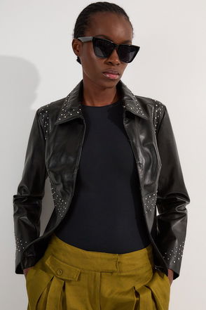 This jacket is your perfect transitional layer. Adding a dose of polish to your tricky between-season outfits, this sleeveless biker is impeccably tailored to your figure. Using clever seaming and a wide buckle belt to pull you in, the piece also comes with glossy button accents at the shoulder epaulettes and pockets for an ultra-elevated finish.