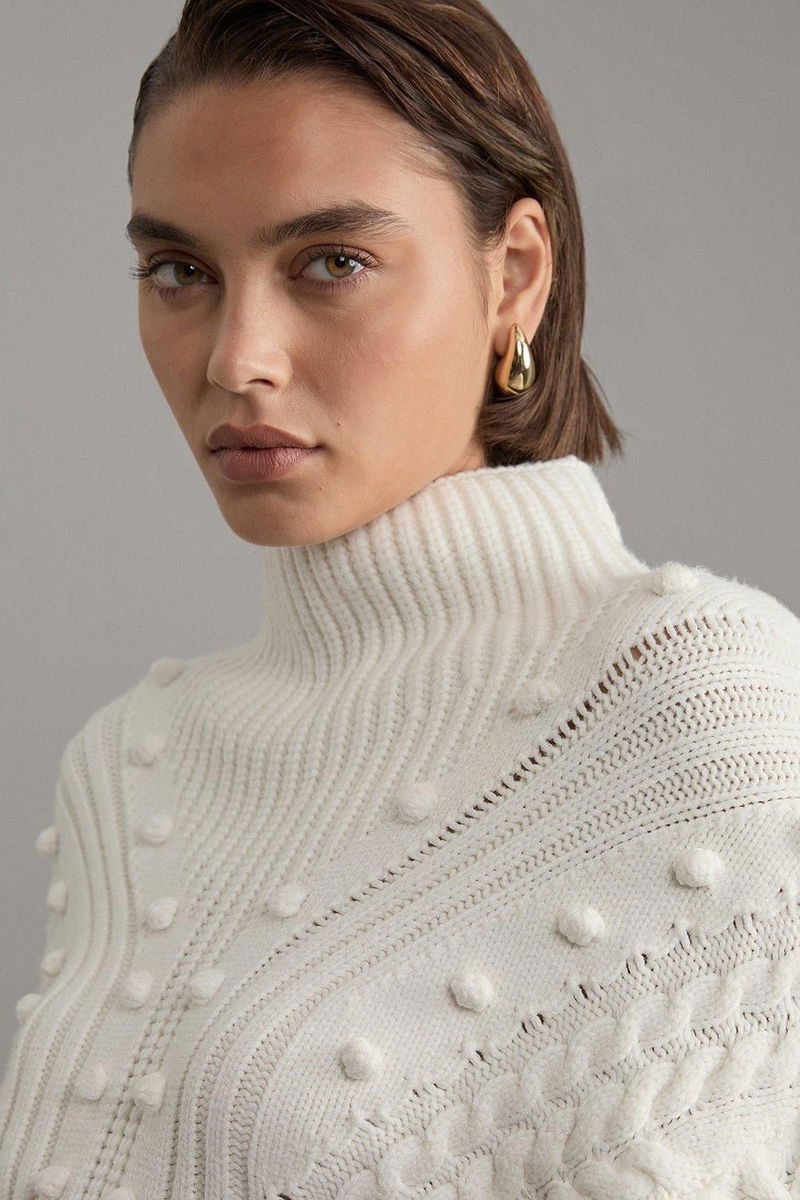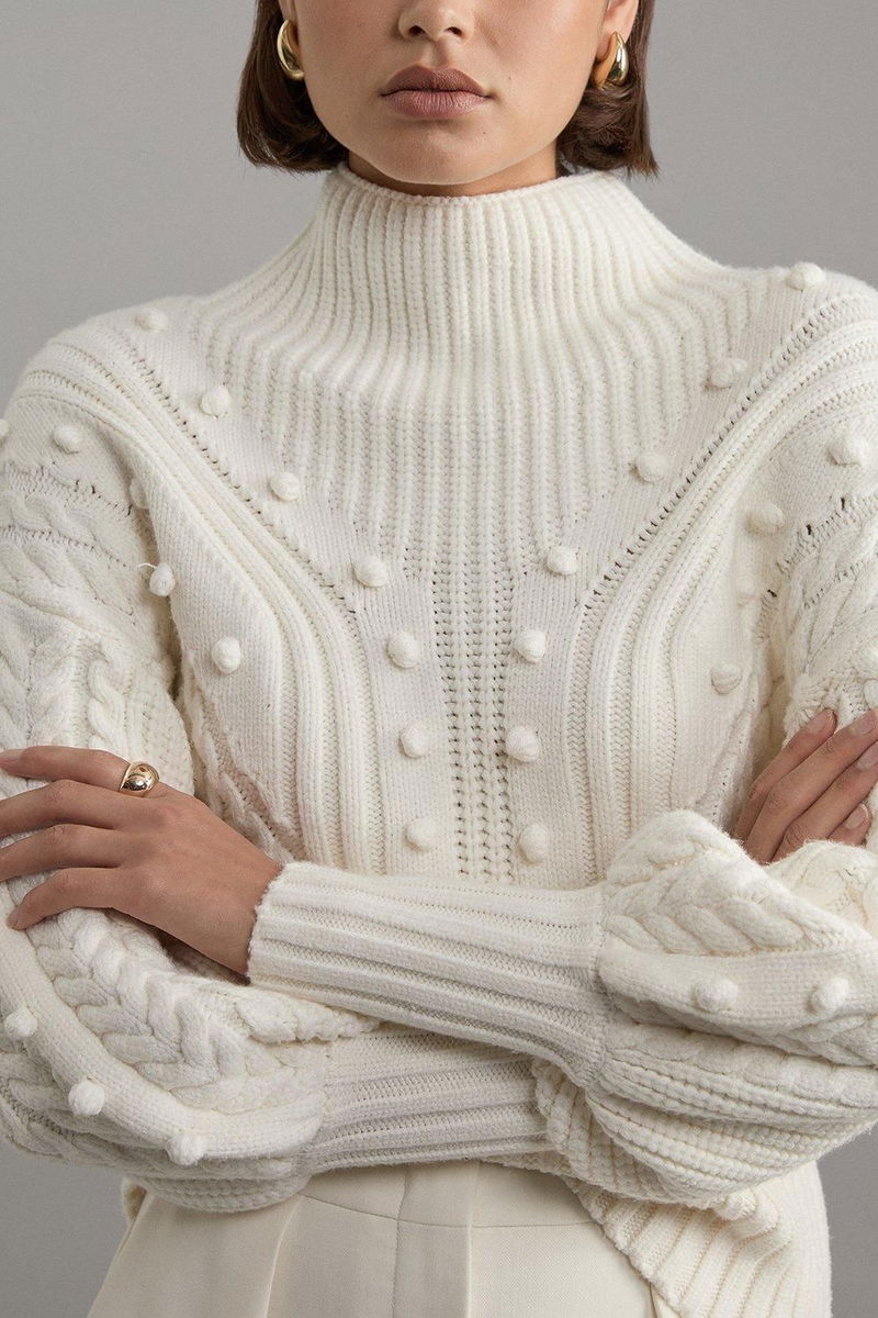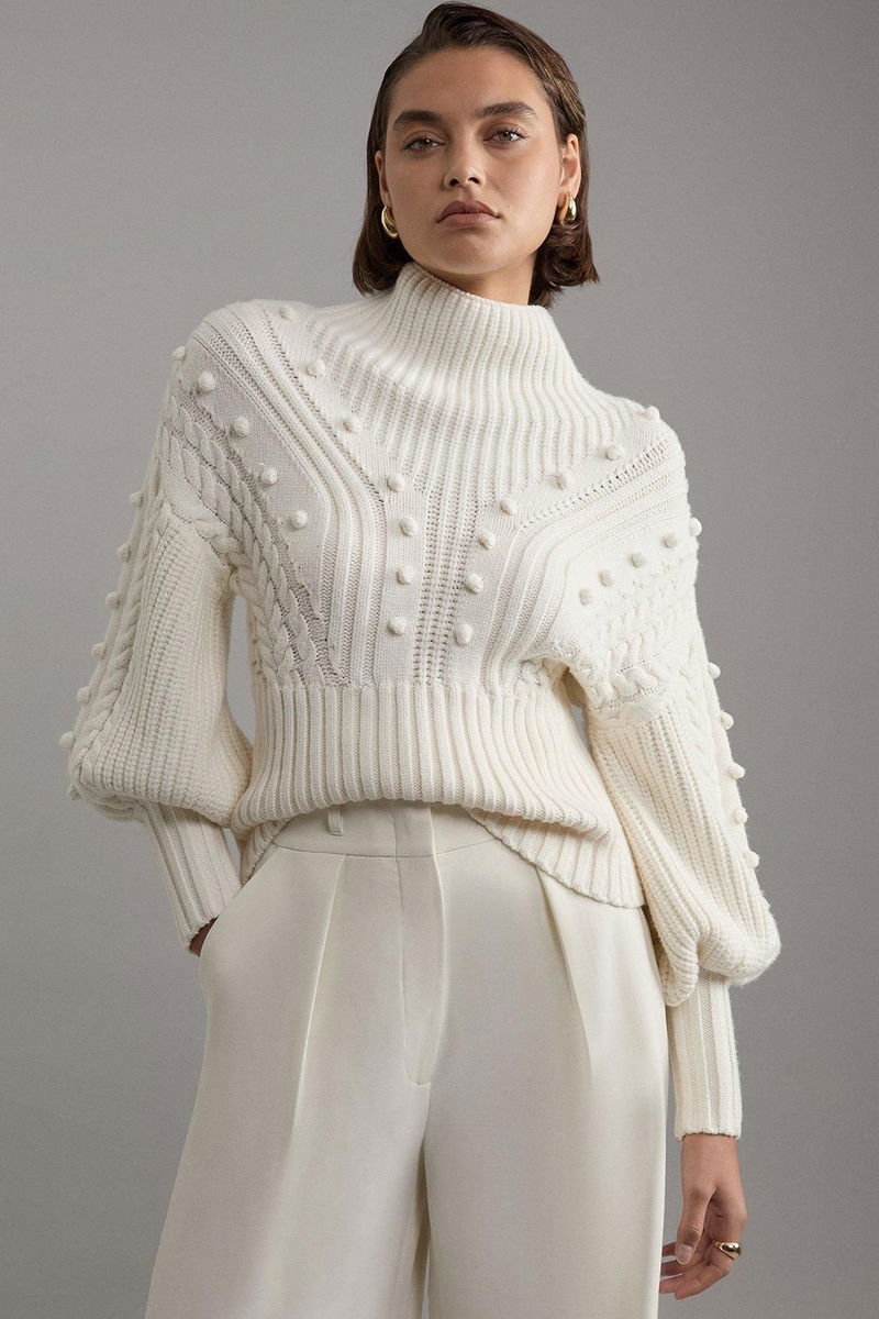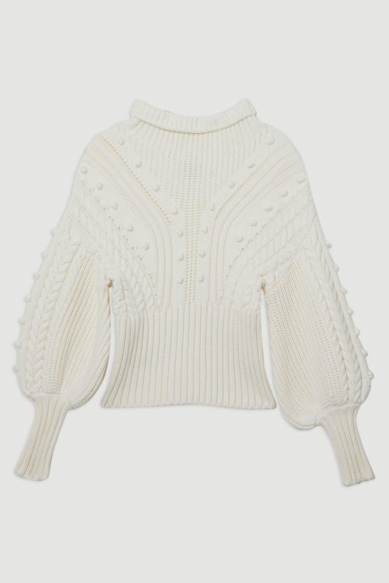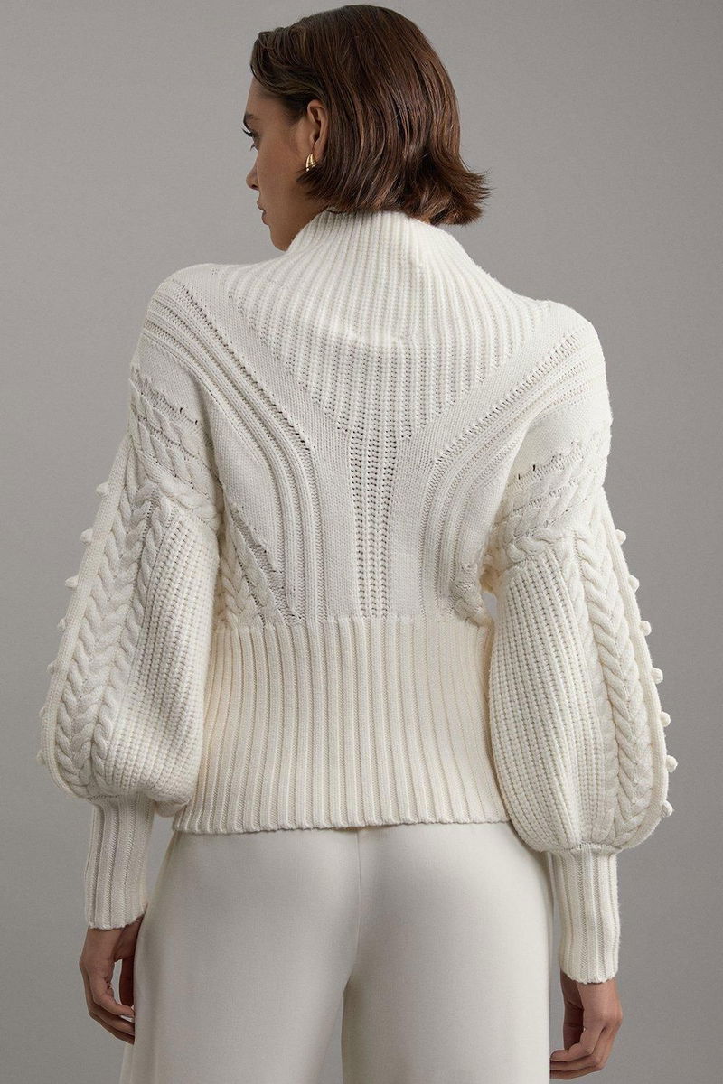 Bobble Detail Balloon Sleeve Cable Knit Viscose Blend Jumper