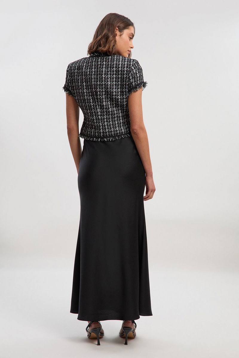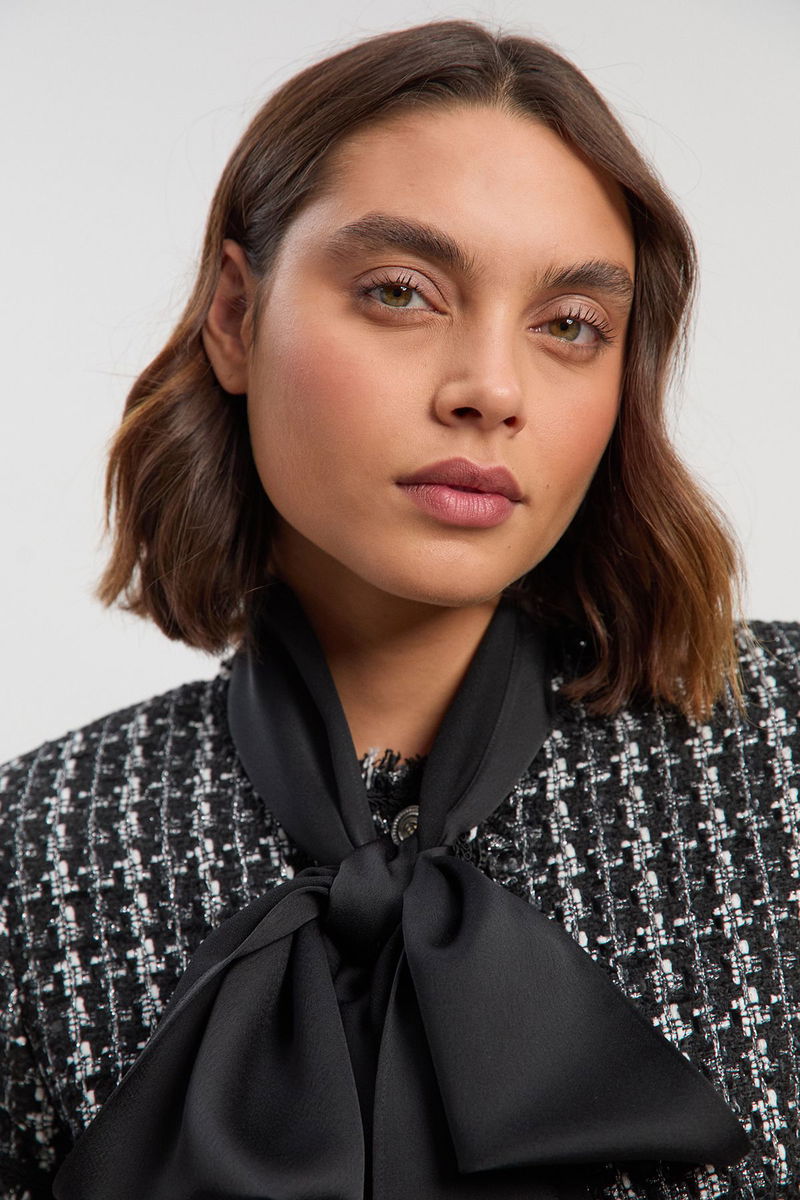 Boucle Tailored Tie Neck Satin Mix Midi Dress
