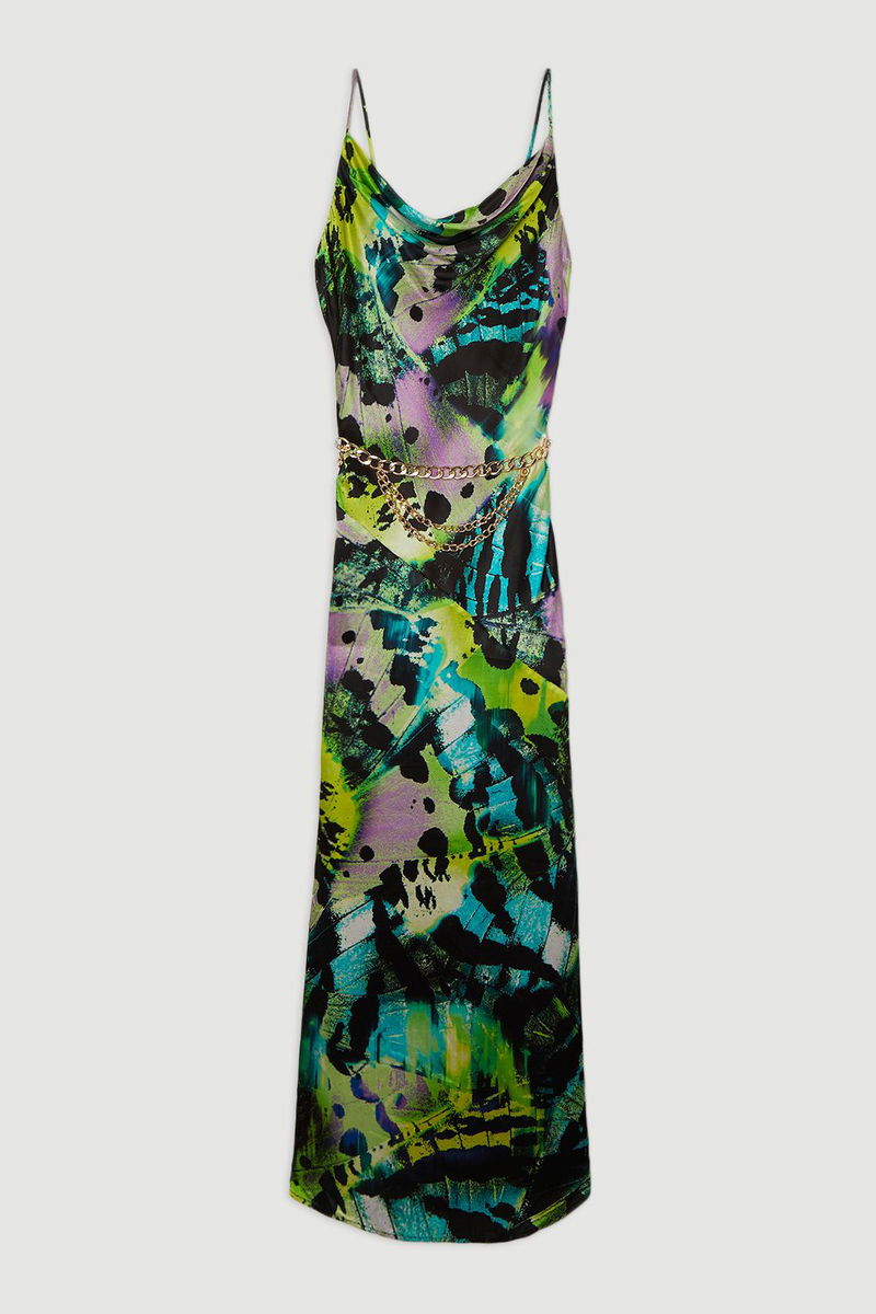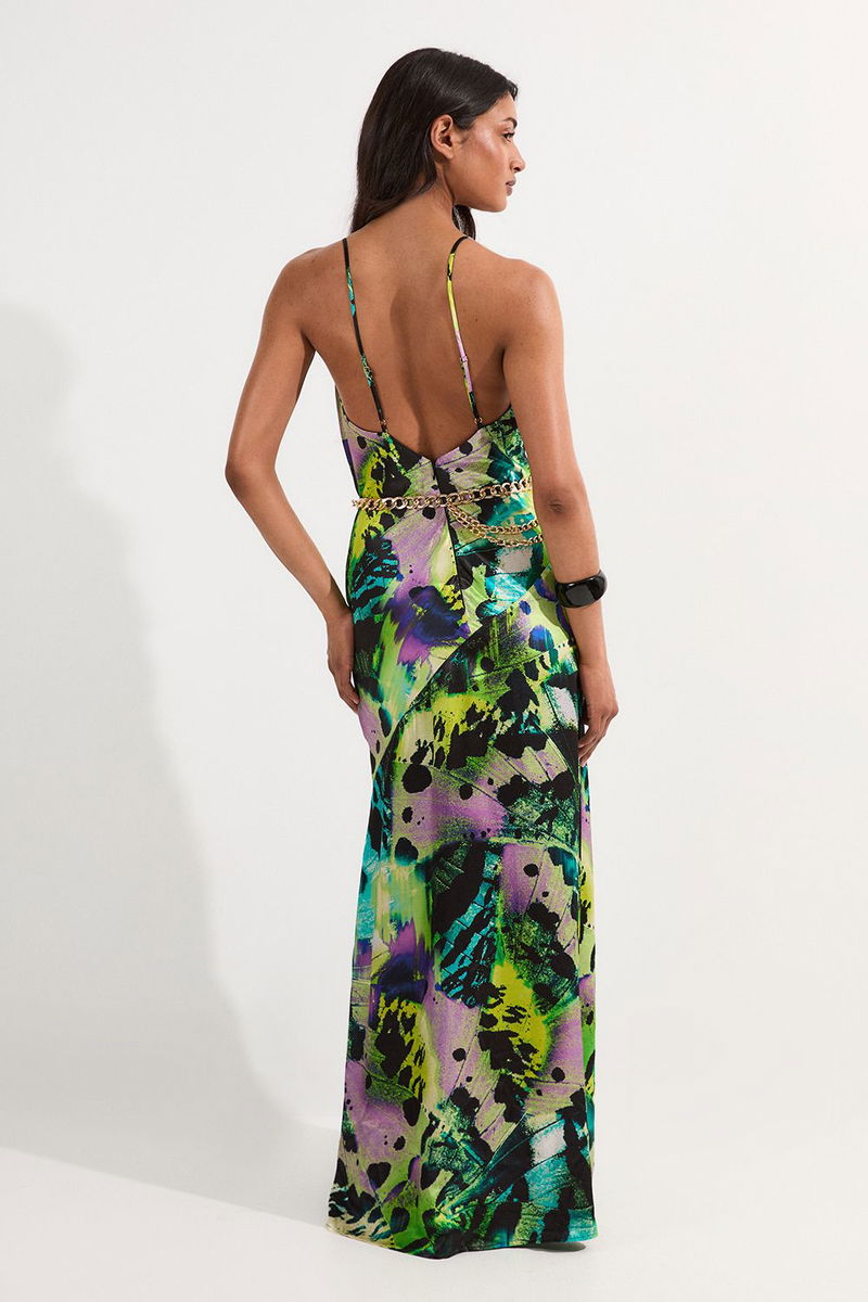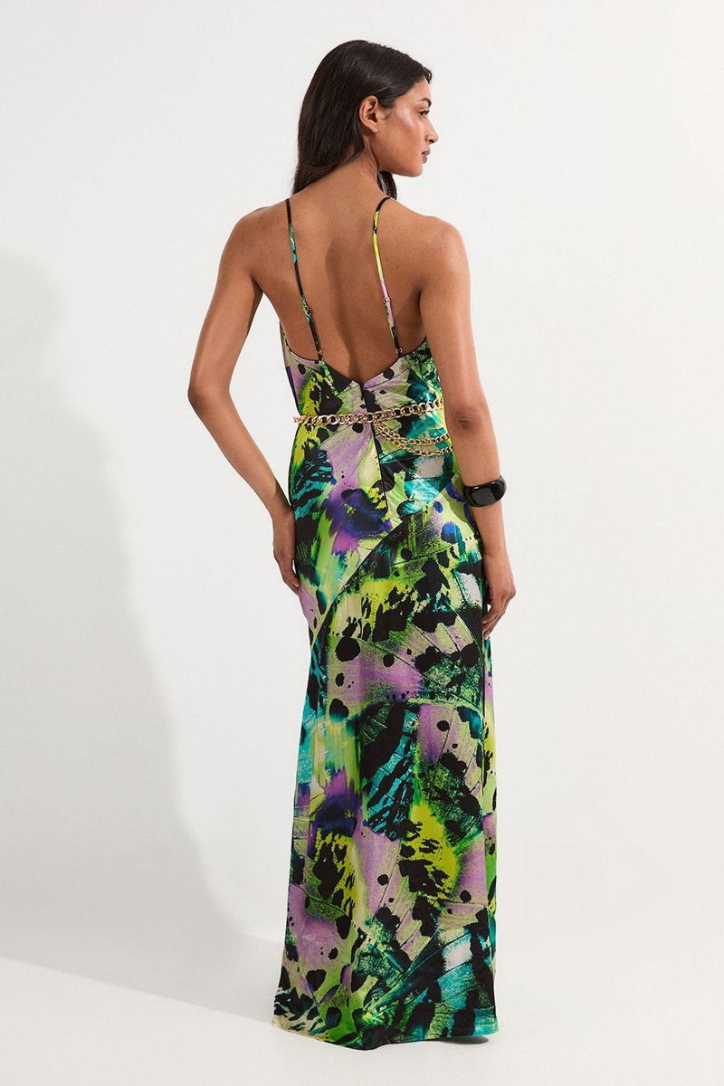 Butterfly Viscose Satin Cowl Detail Belted Maxi Dress