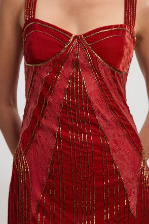 You'll own the room in this showstopping dress. Elegantly crafted in a column V-neck silhouette that skims your figure to perfection, the dress is peppered with glossy buttons for added luxury. Statement sleeves and a high-back split are dramatic design details, while cut-out back panelling and a glossy zipper hint at after-dark allure.