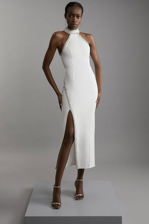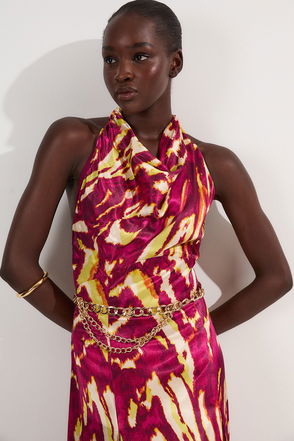 The future looks monochrome in this dress. Your new-season essential, it’s been cleverly designed with contrasting panels that’ll give the appearance of a streamlined silhouette. It also features a flattering halterneck bodice, gold chain detail and falls just below the knee.