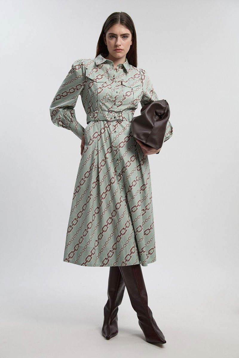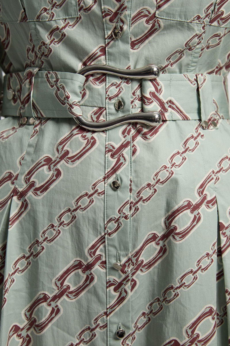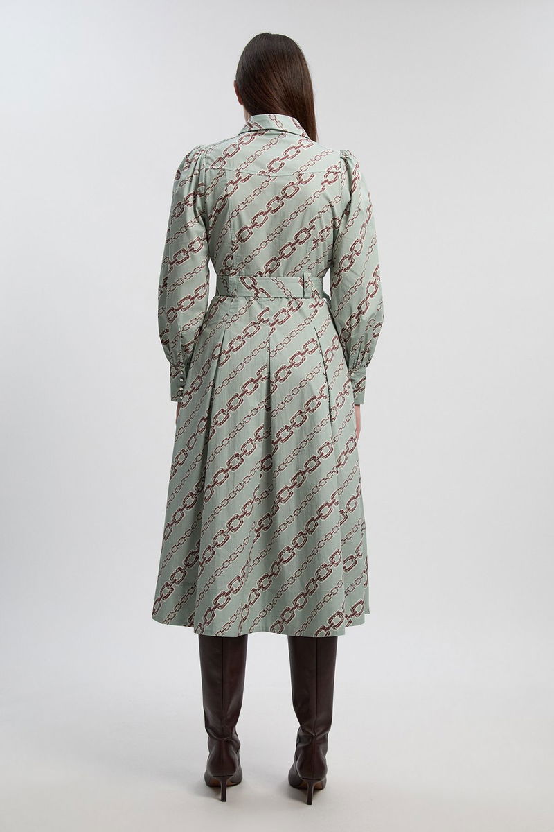 Chain Print Cotton Sateen Belt Detail Woven Shirt Dress