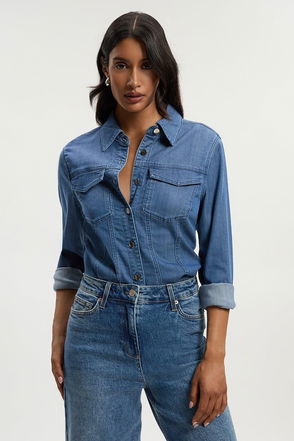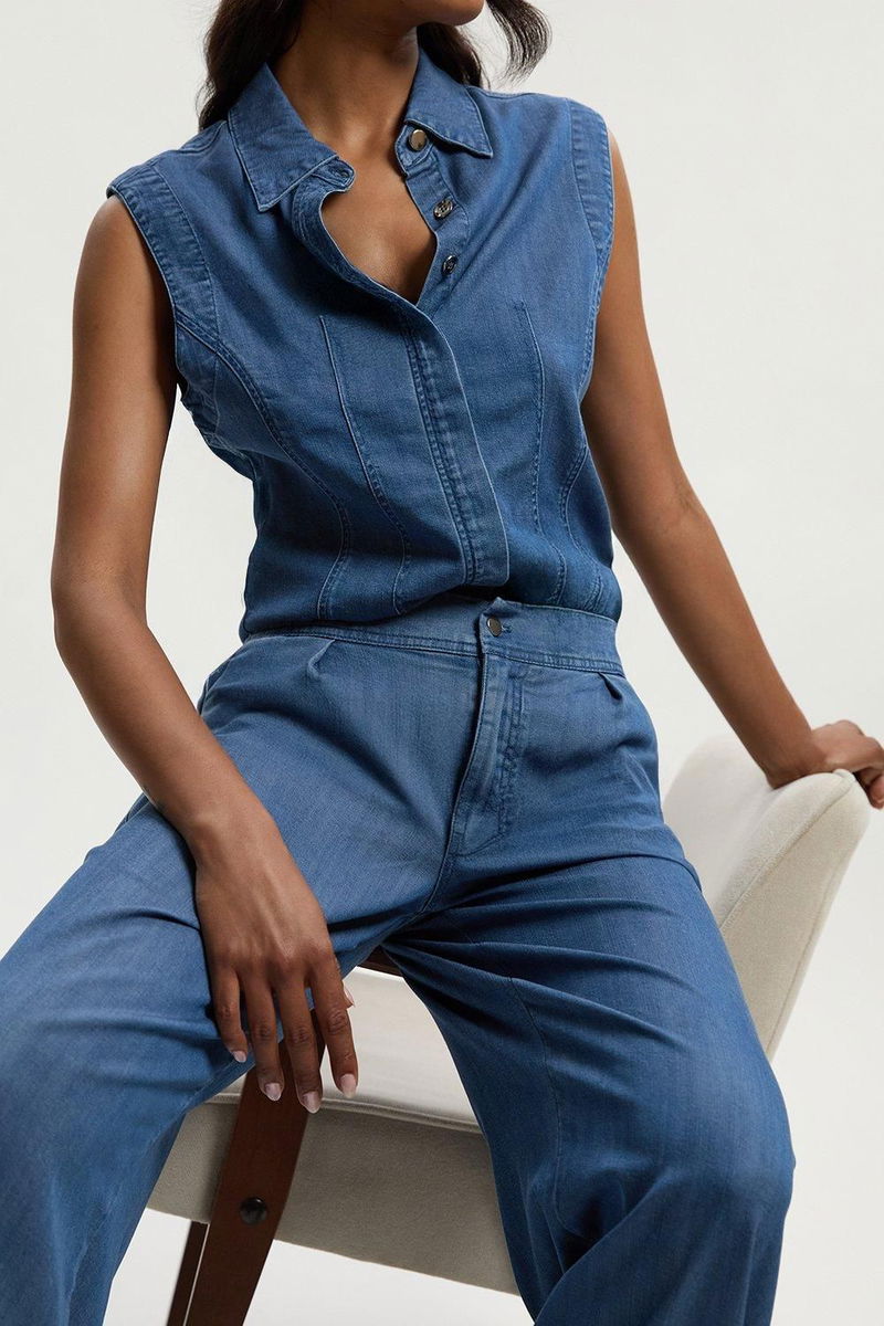 Chambray Stretch Denim Sleeveless Collared Top