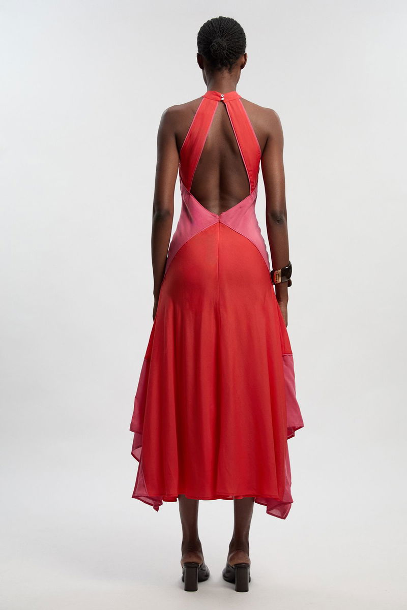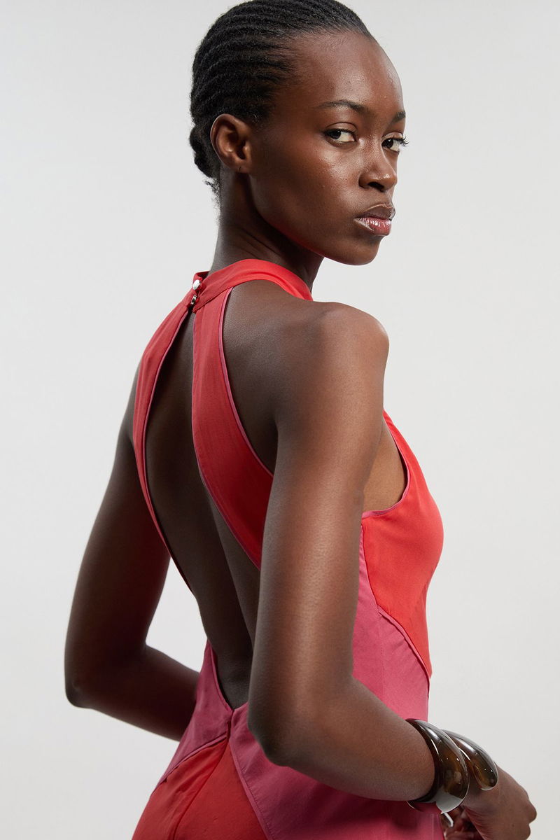Colour Block Fluid Tencel Halter Neck Woven Maxi Dress.