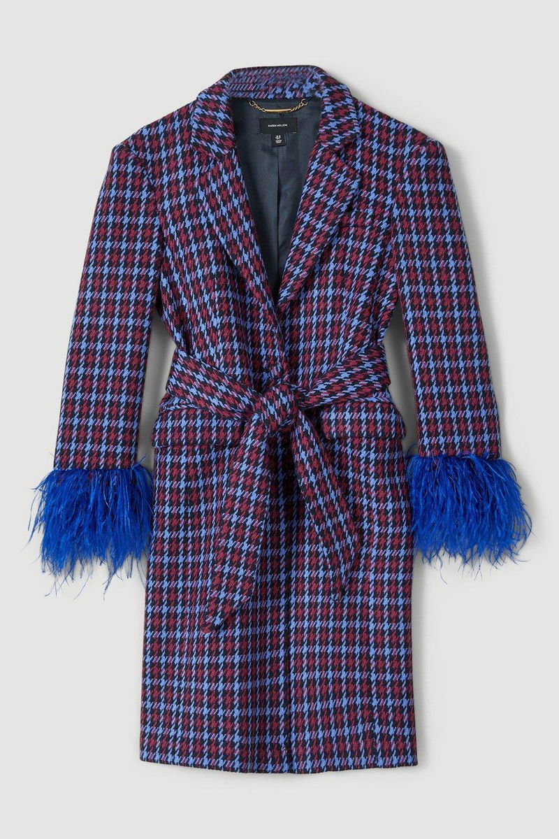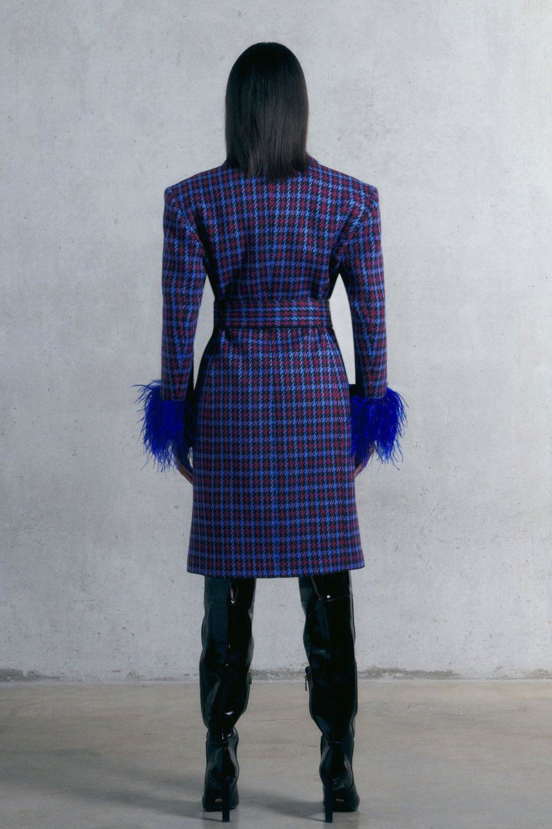 Trimmed with plumes of cobalt feathers, this tweed jacket puts an electric twist on traditional tailoring. Strong shoulders and a wrap belt create a flattering hourglass effect, while traditional tweed details ensure sophistication from every angle.