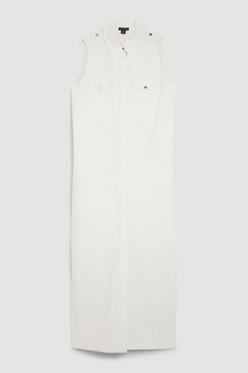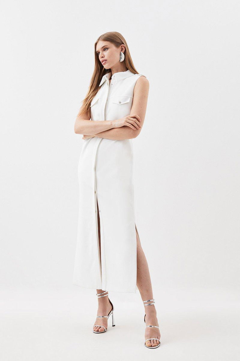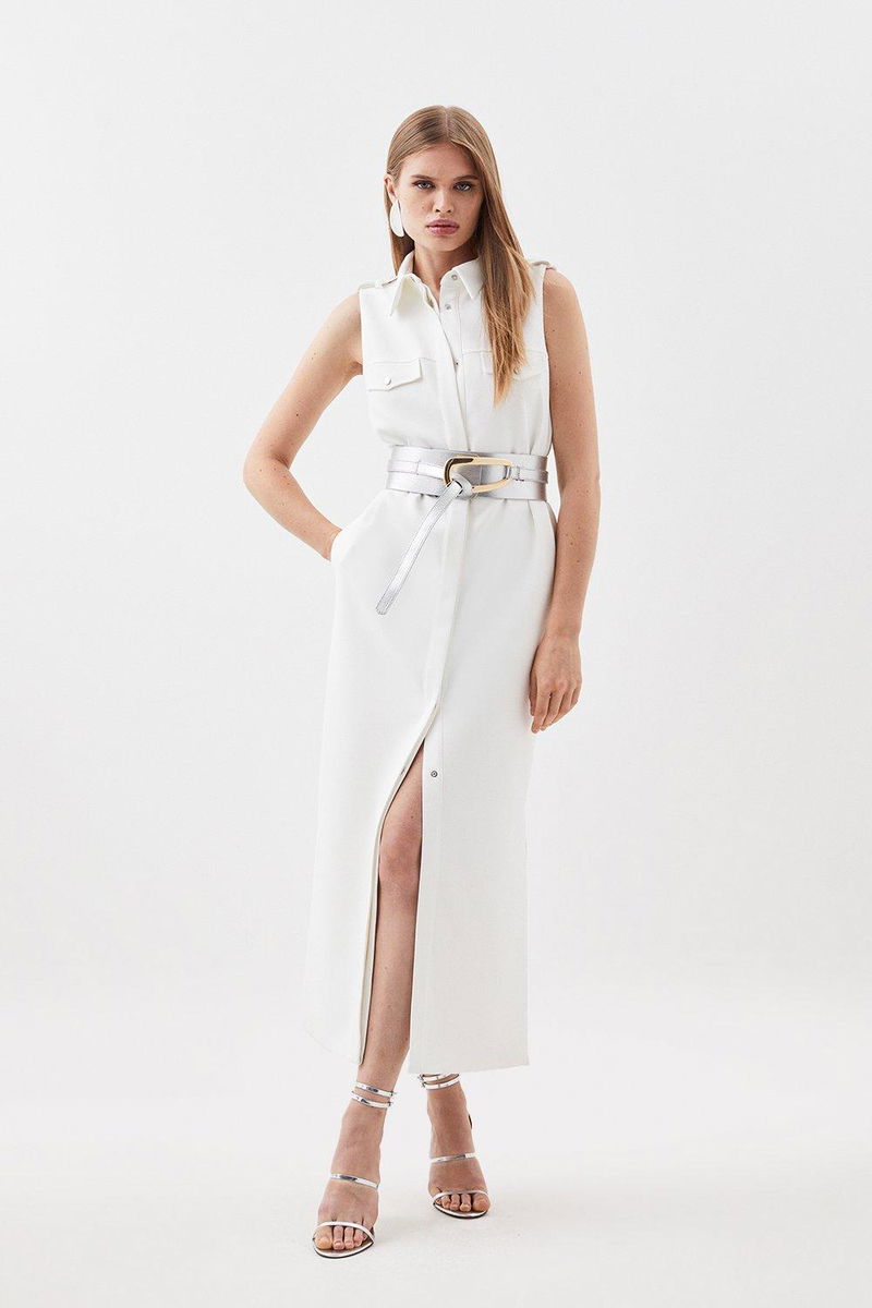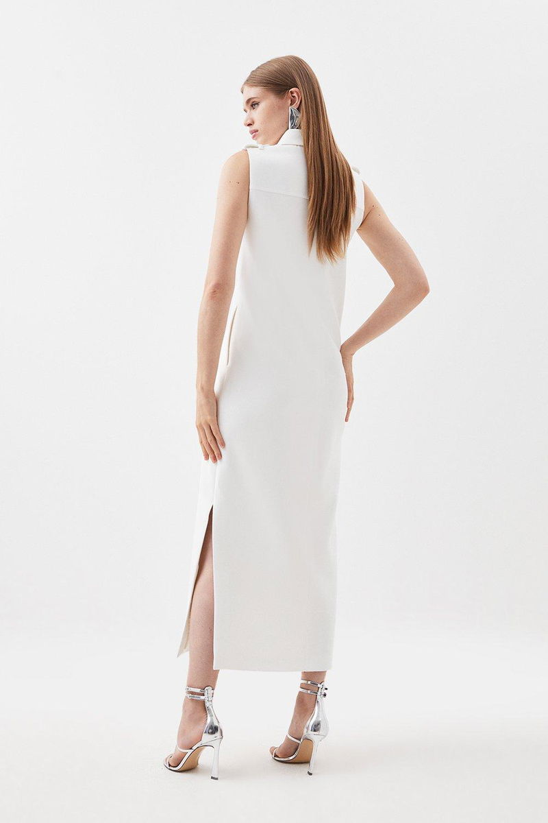 The streamlined proportions of the tailored shirt dress are elevated further by the statuesque quality of Compact Stretch, creating a sculpting column fit. Contemporary tailored elements appear, with a spread collar, concealed placket, polished hardware, and chest pockets.