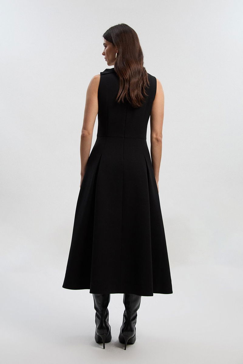 Compact Stretch Bow Tie Neck Trim Detail Tailored Full Midi Dress
