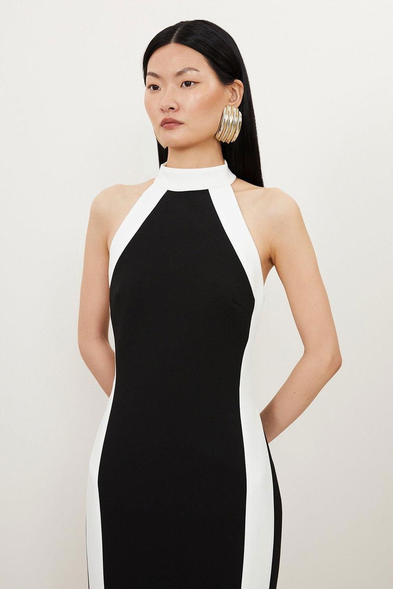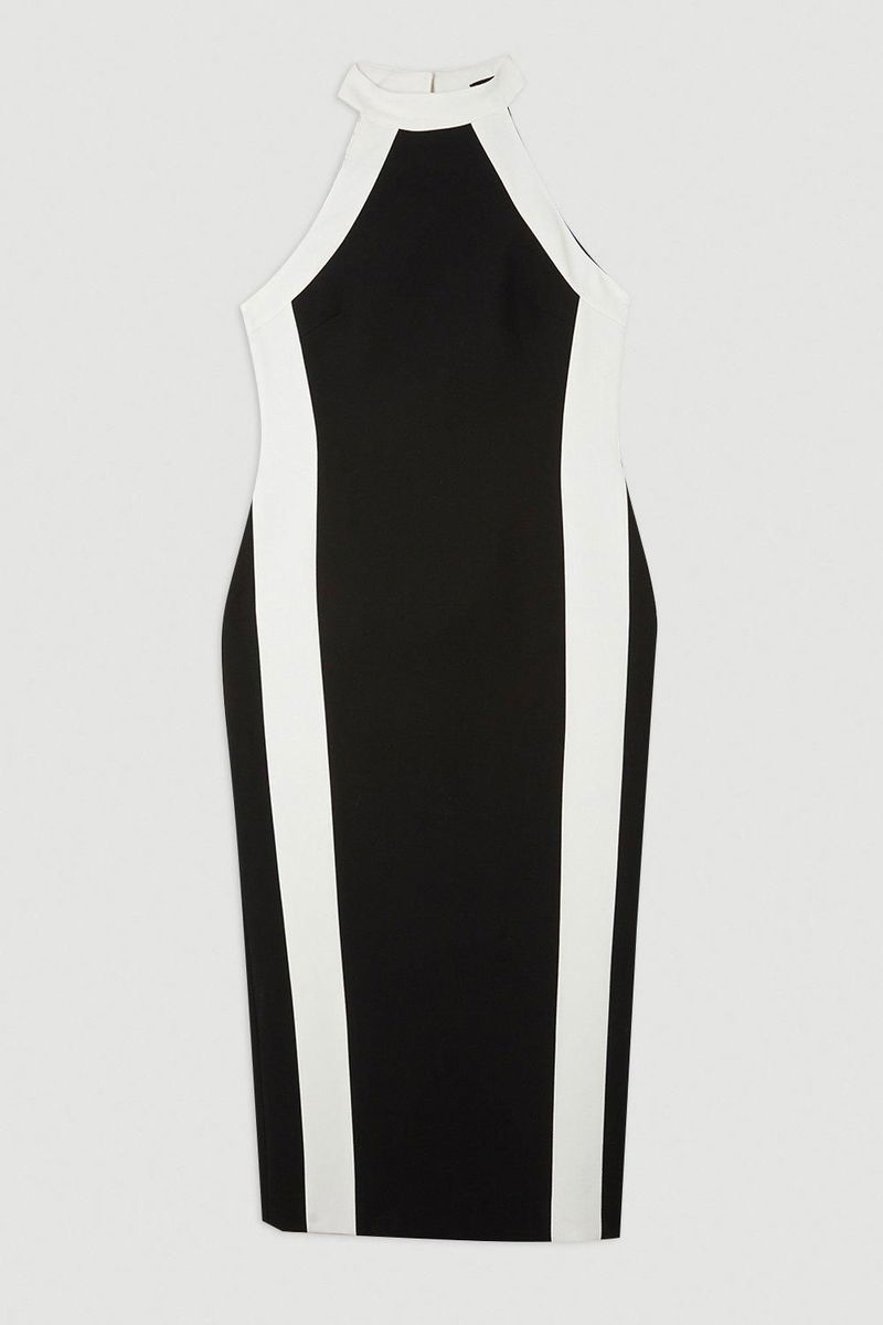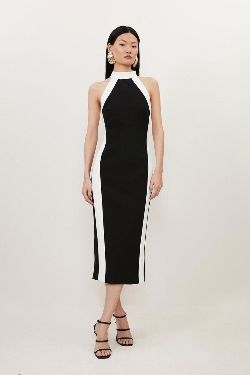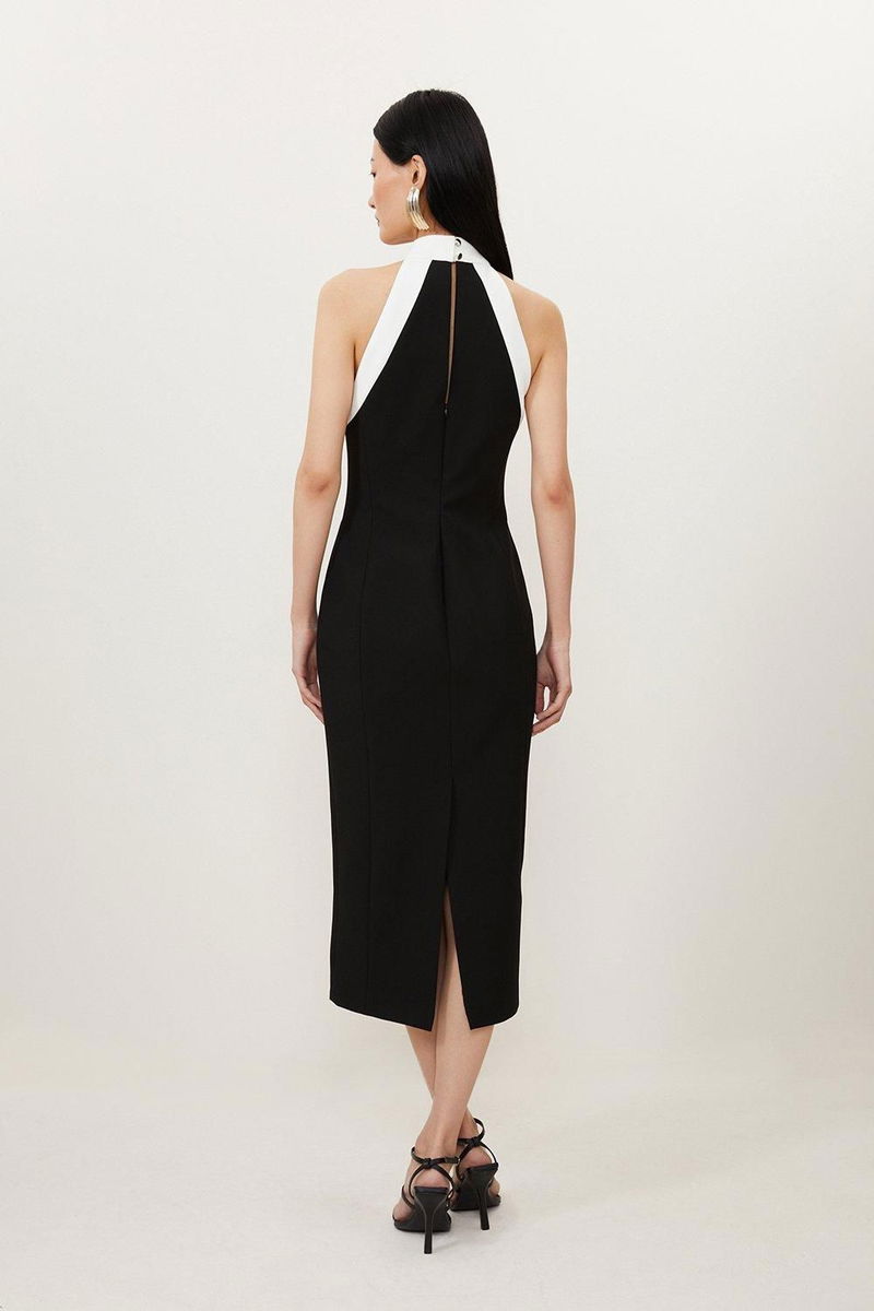 Compact Stretch Contrast Halter Neck Tailored Midi Dress