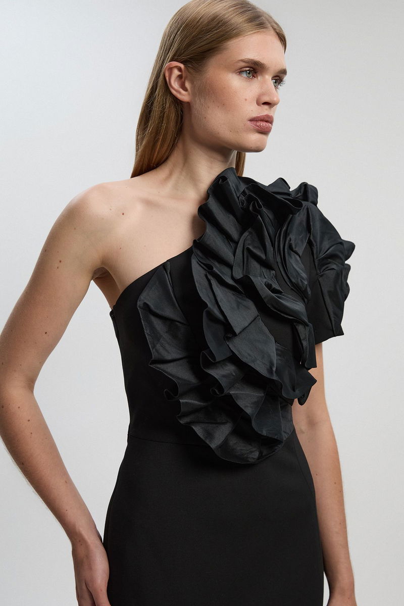 Compact Stretch Taffeta Ruffle One Shoulder Midi Dress