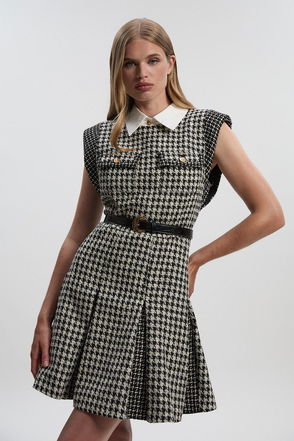 Everyday dressing? Think monochrome. Detailed with a contrasting frill collar and cuffs, alongside a belted waist and swishy pleated skirt, this dress is the definition of easy elegance.