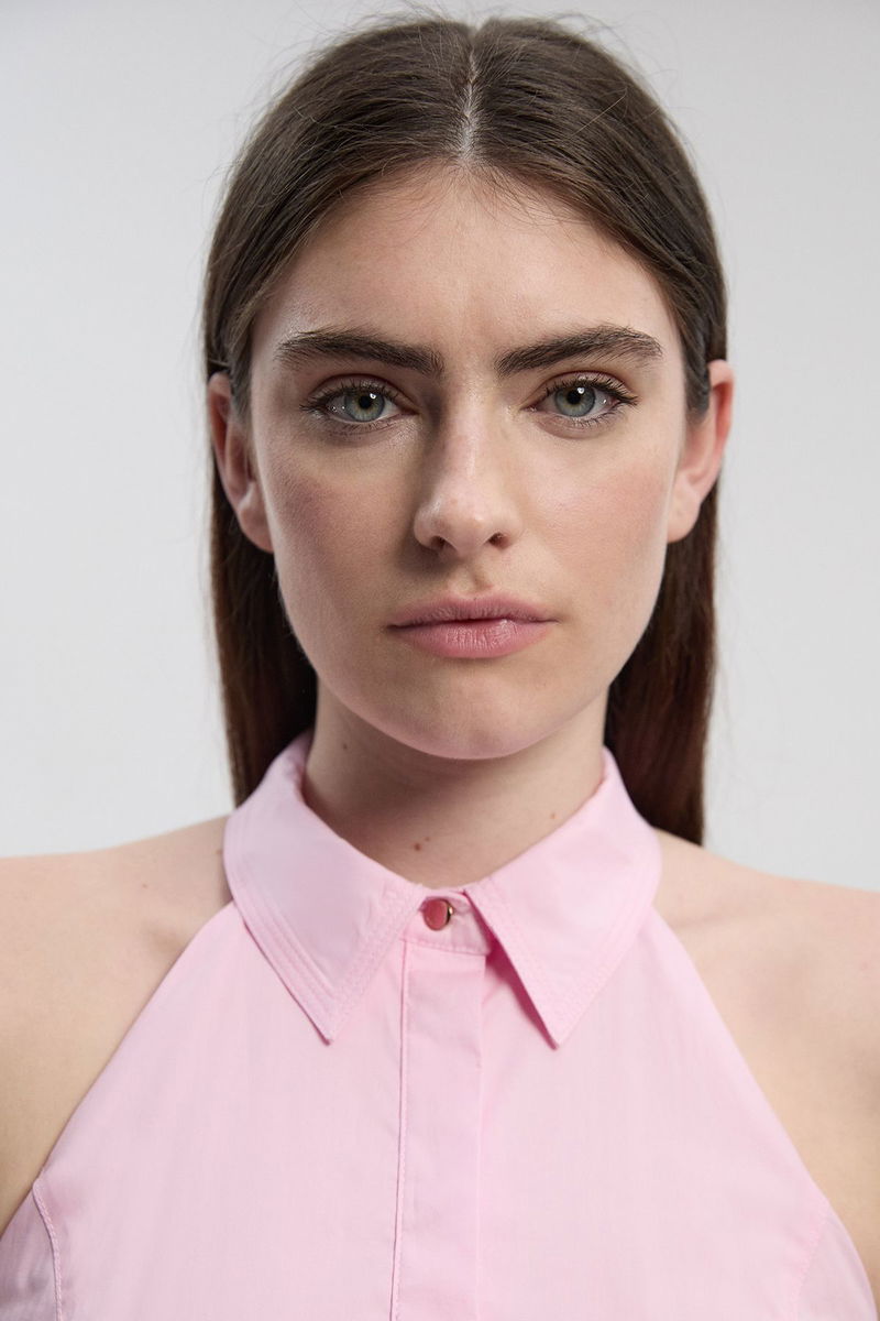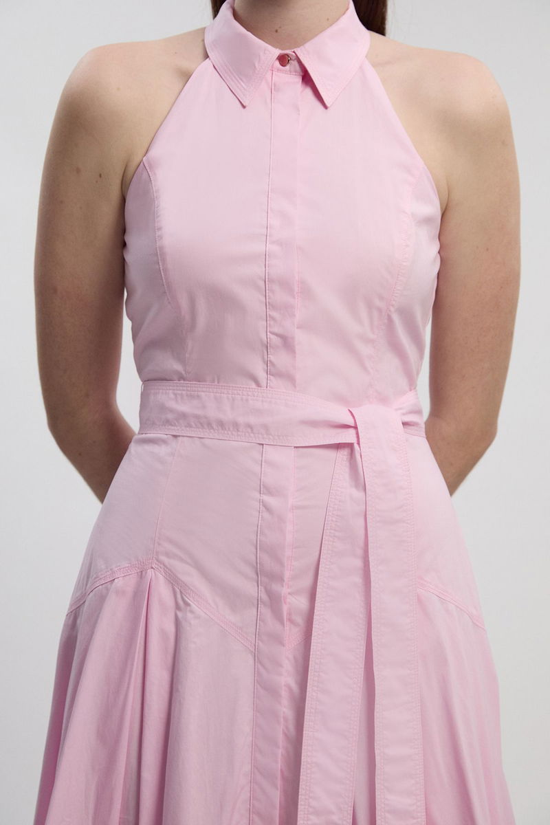 Cotton Collared Halter Neck Woven Midi Shirt Dress With Dropped Waist Detail
