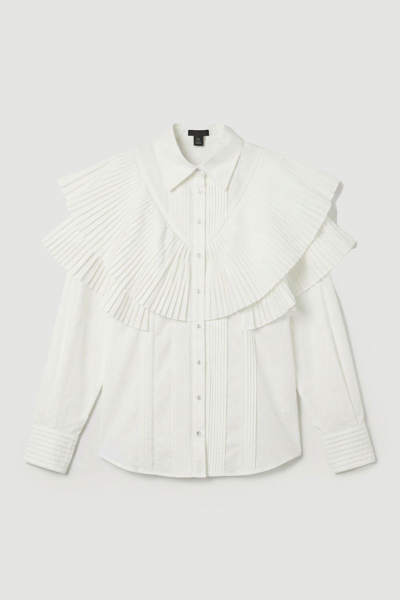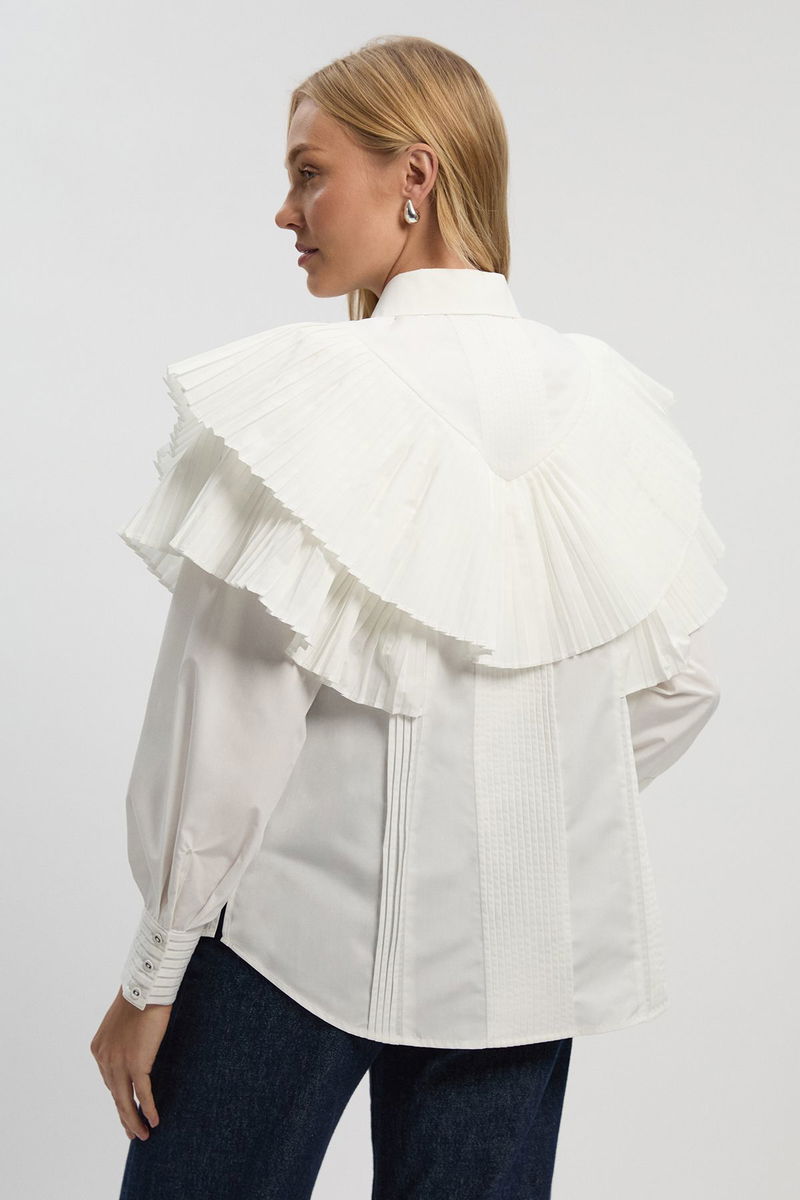 Cotton Poplin Ruffle Detail Long Sleeve Woven Collared Shirt