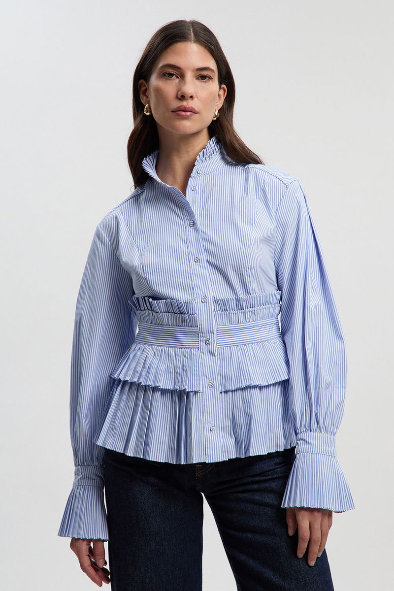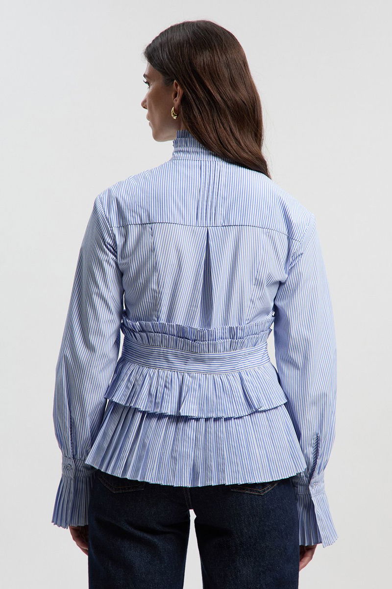Cotton Poplin Stripe Tiered Ruffle Detail Long Sleeve Woven Blouse