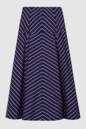 This Karen Millen Cotton Stripe Full Midi Skirt is a versatile addition to your wardrobe, perfect for various daytime occasions. The bold chevron stripe pattern adds a dynamic element to your ensemble, while the full midi length provides both coverage and freedom of movement. Style this skirt with a simple tucked-in blouse and flat sandals for a chic, casual look ideal for family gatherings or weekend brunches.