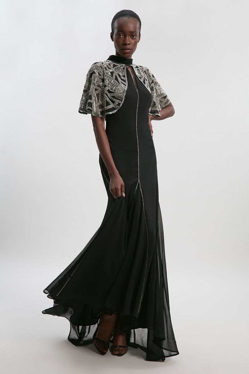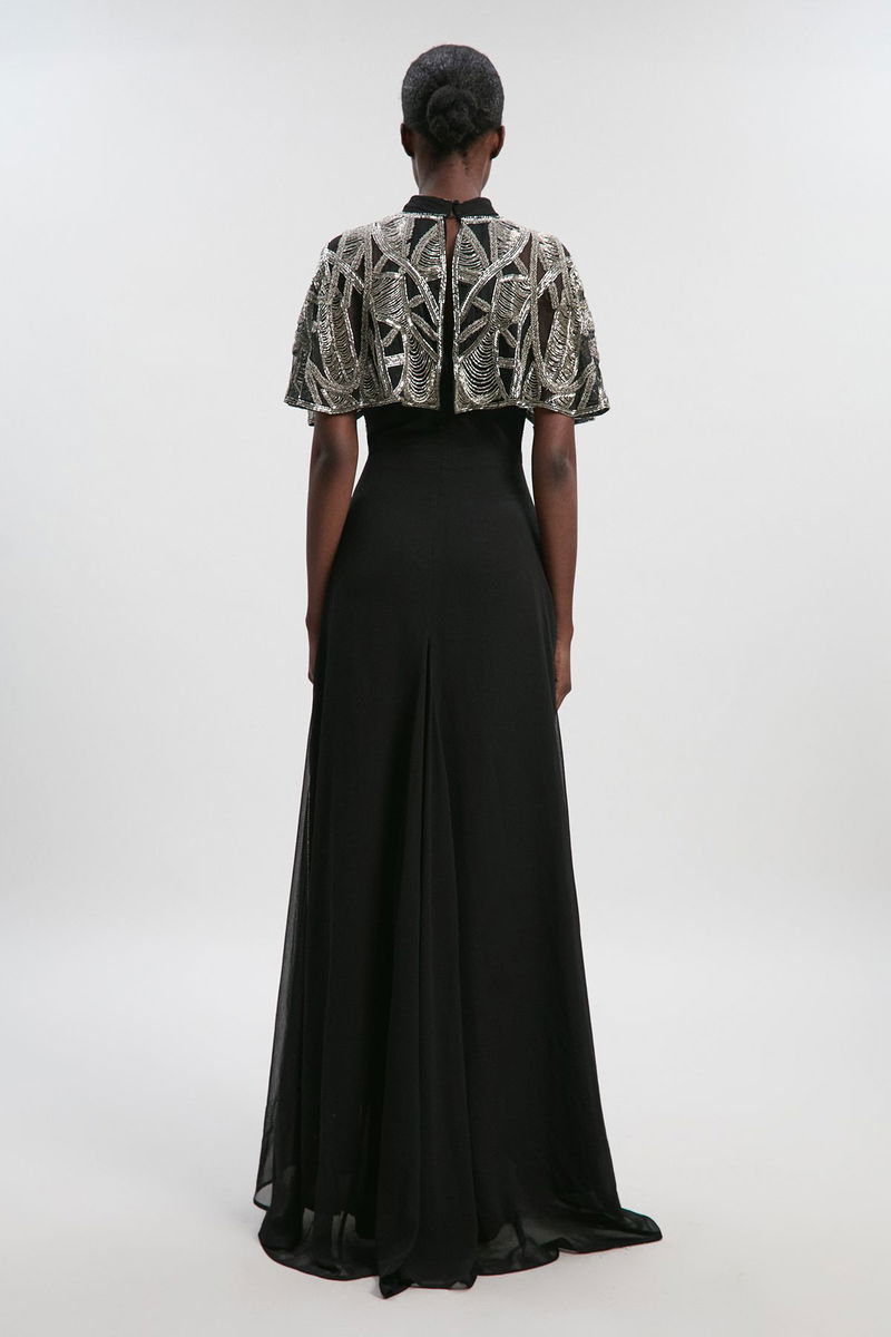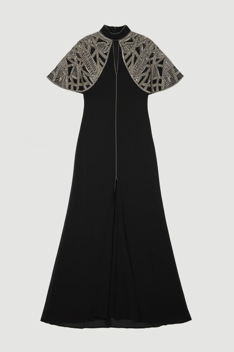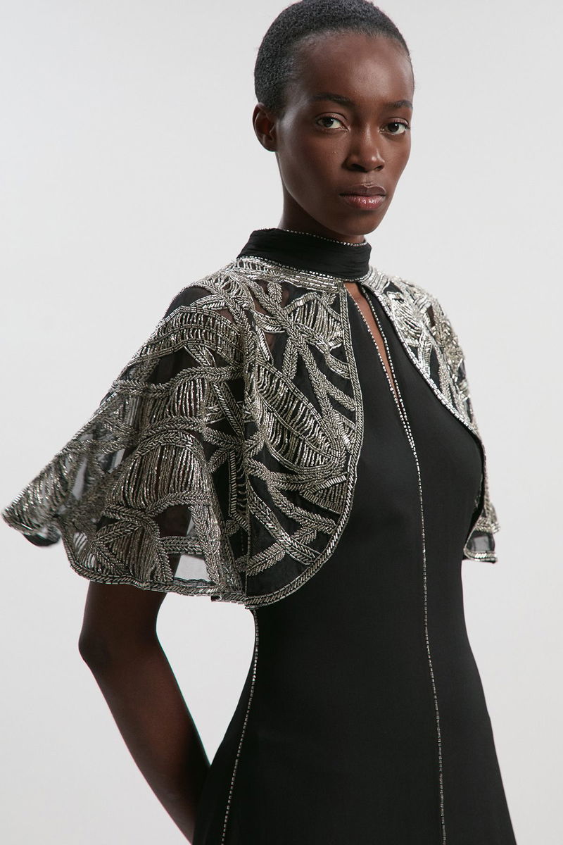 Crystal Embellished Cutwork Cape Detail Woven Maxi Dress