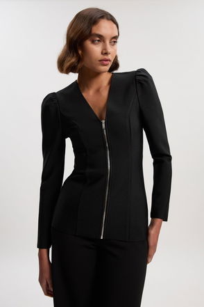 Crafted in a form-fitting bandage knit, this jacket is super versatile and super flattering. Whether worn zipped up or left open, your figure remains beautifully defined. Elevated by luxurious military buttons and textured trims, it’ll add polish to anything you pair it with.