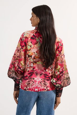 Channel a little femininity with blouse. Designed in a soft fabric that beautifully drapes the figure, the piece features a high neck lace cut-work yoke, pleated trims and button-detailed cuffs.