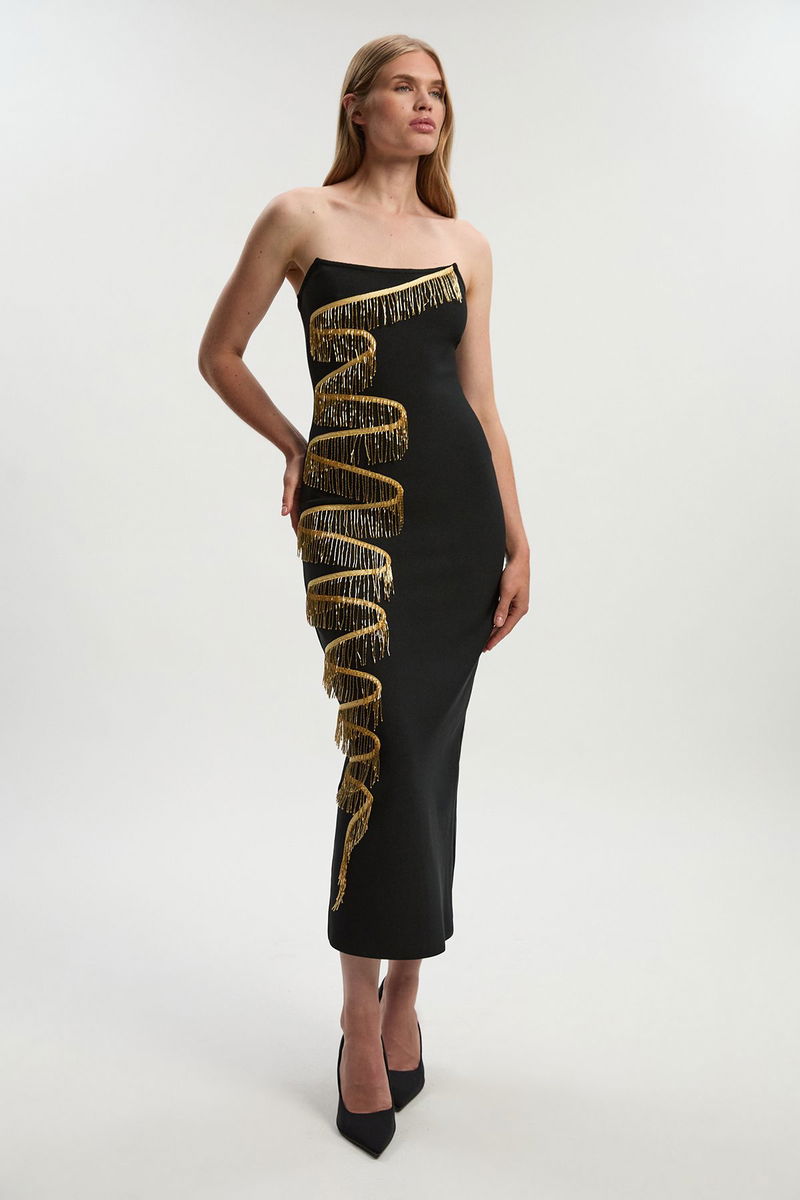 Embellished Fringe Bandeau Figure Form Maxi Dress