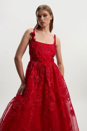 Embroidered Applique Crinkle Deep V Woven Midi Prom Dress.