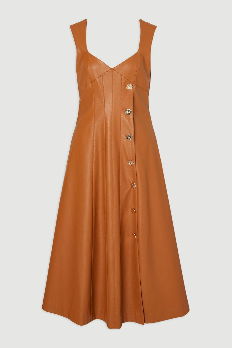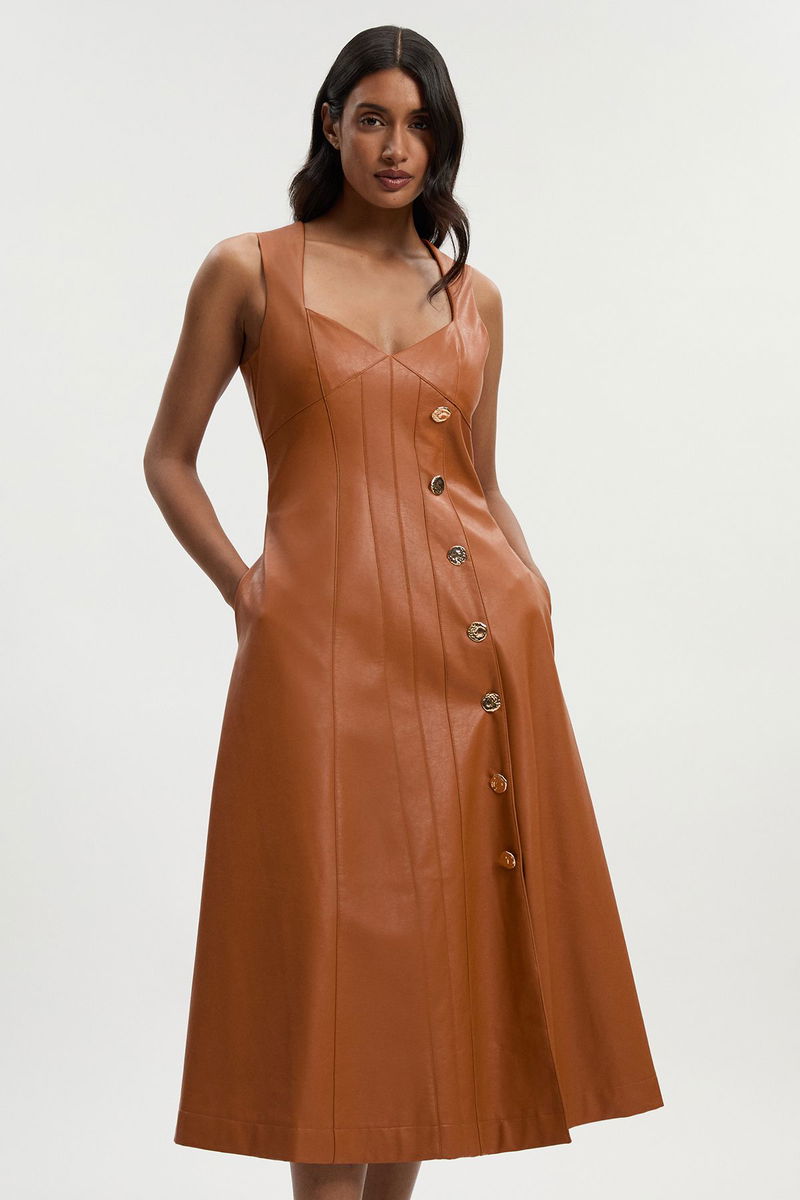 Faux Leather Button Detail Sleeveless Midi Dress