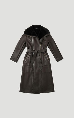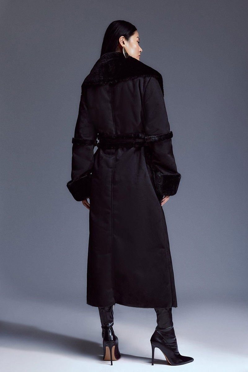 Faux Shearling Collar & Cuff Tie Belt Maxi Coat