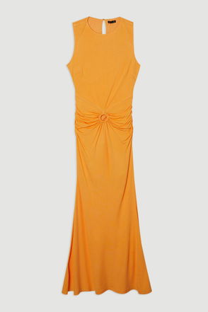 Trimmed with vivacious plumes of feathers, this Bardot maxi dress is true showstopper. A high leg slit adds a sultry element, while stretch crepe fabric subtly hugs the form to create a streamlined silhouette. Style this dress with pointed heels and glamorous accessories for an elevated evening look.