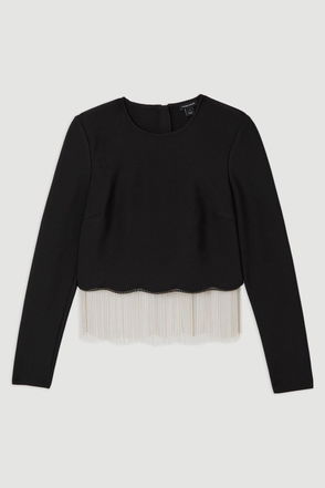 A walking work of art, this top makes an unforgettable entrance. Bandage fabric sculpts the silhouette, while a corset bodice is adorned with layers of organza frill, creating a high-drama look. Pair with a maxi pencil skirt, bold heels and accessories for an after-dark ensemble.