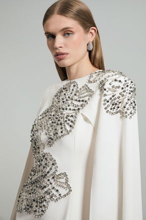 With a fit that flatters the curves, as well as the flowing cape, this dress is certain to turn heads. The cape accent over the shoulders is perfect for adding a little formality to the look, and the sparkling embellishments makes for a statement, formal piece. Style this piece with strappy heels for an occasion look perfect for parties and special events.