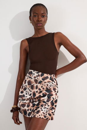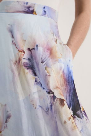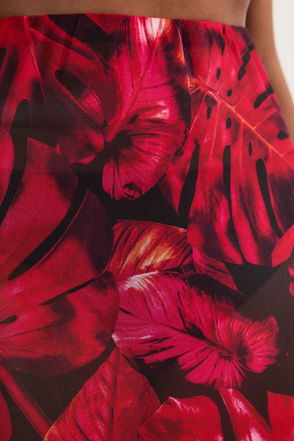 Floral palm printed ruched woven beach skirt.