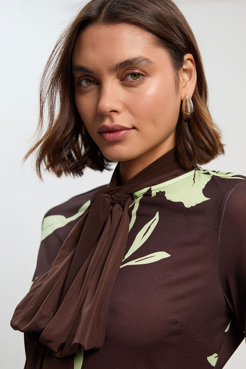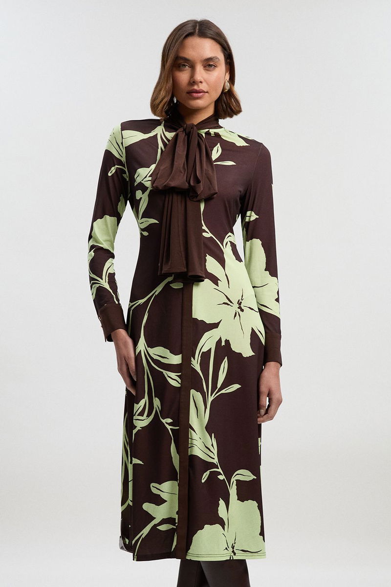 Floral Print Bow Detail Ruched Long Sleeve Crepe Maxi Dress