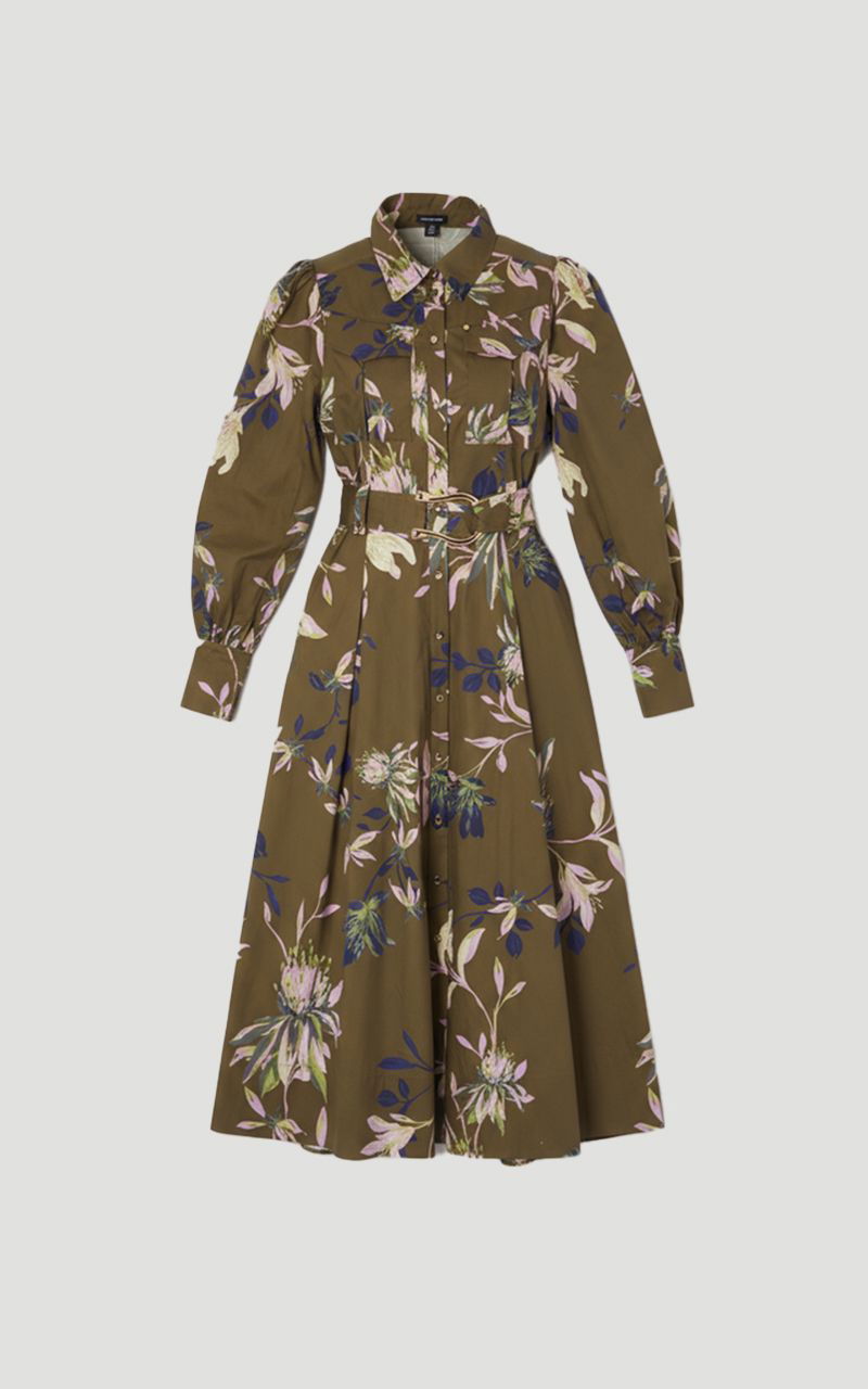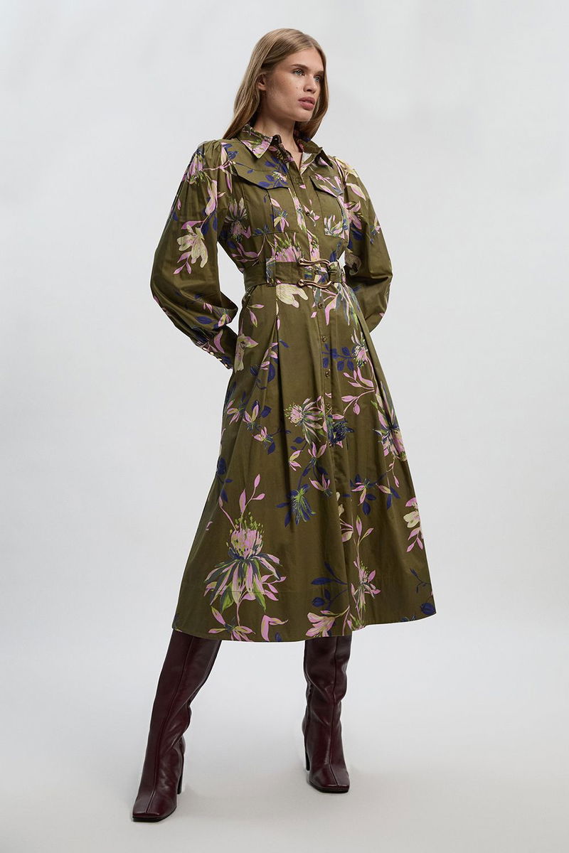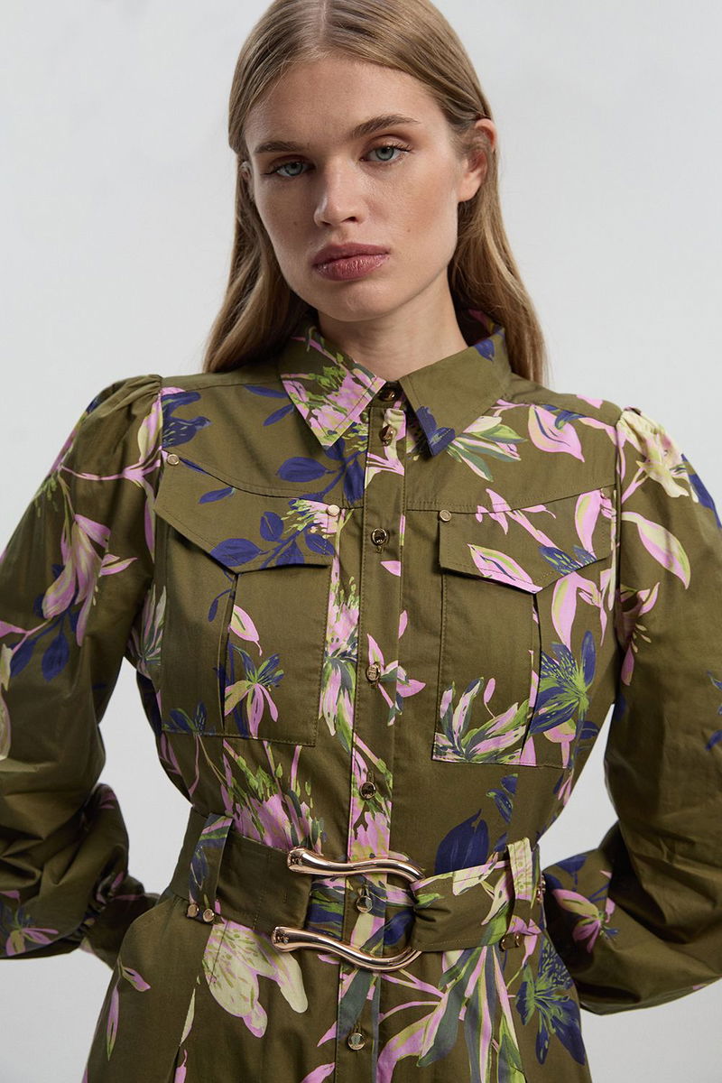 Floral Print Cotton Sateen Woven Midi Shirt Dress