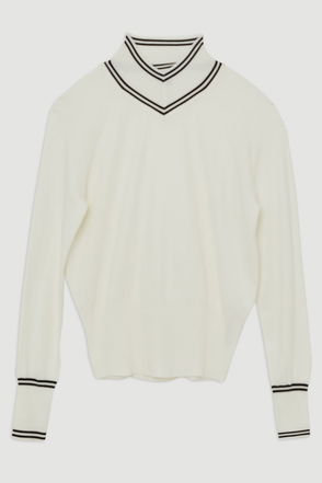 This jumper makes knitwear a luxurious affair. Designed with sleeves fabricated from a billowing, sheer georgette fabric, this knit offers a dose of allure to your cold-weather styling. Glossy popper buttons perfectly compliment the piece, while an open pointed collar adds an unexpected, retro touch.