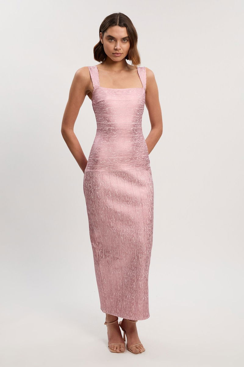 Foil Metallic Figure Form Bandage Strappy Knit Maxi Dress