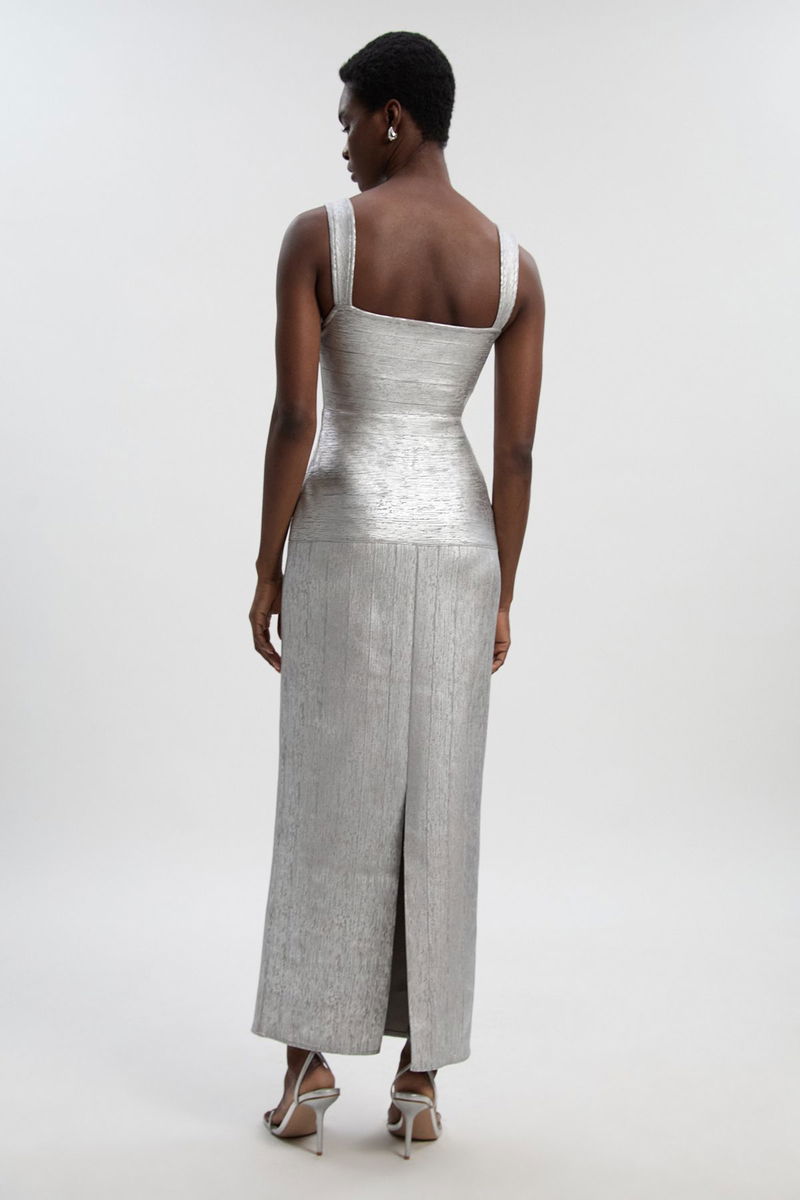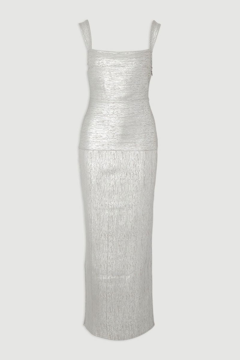 Foil Metallic Figure Form Strappy Knit Maxi Dress