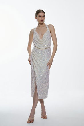 Make a lasting impression at your next formal event with this captivating halter pleated woven maxi dress from Karen Millen. The dress showcases a stunning halterneck design, complemented by an eye-catching choker-style collar that adds a contemporary twist to the classic silhouette. The pleated bodice creates visual interest and texture, while the flowing maxi length ensures an elegant and graceful appearance.