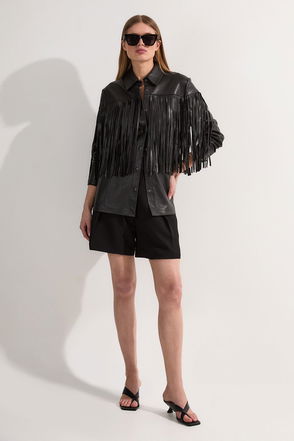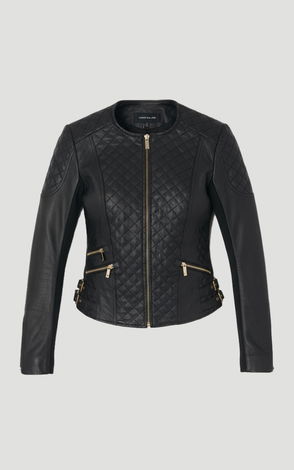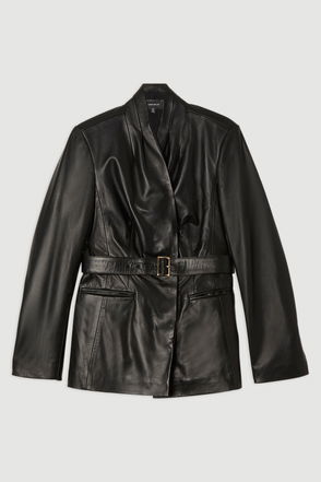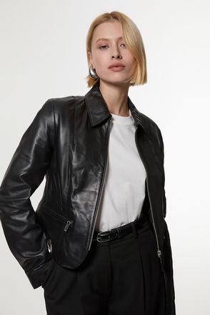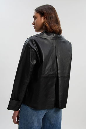 Elevate your outer layers with a classic leather jacket, with a relaxed silhouette, metallic hardware, and a collarless design. Style it with anything, from a dress, to tailored trousers, to jeans for an elevated look that will take you seamlessly from day to night.