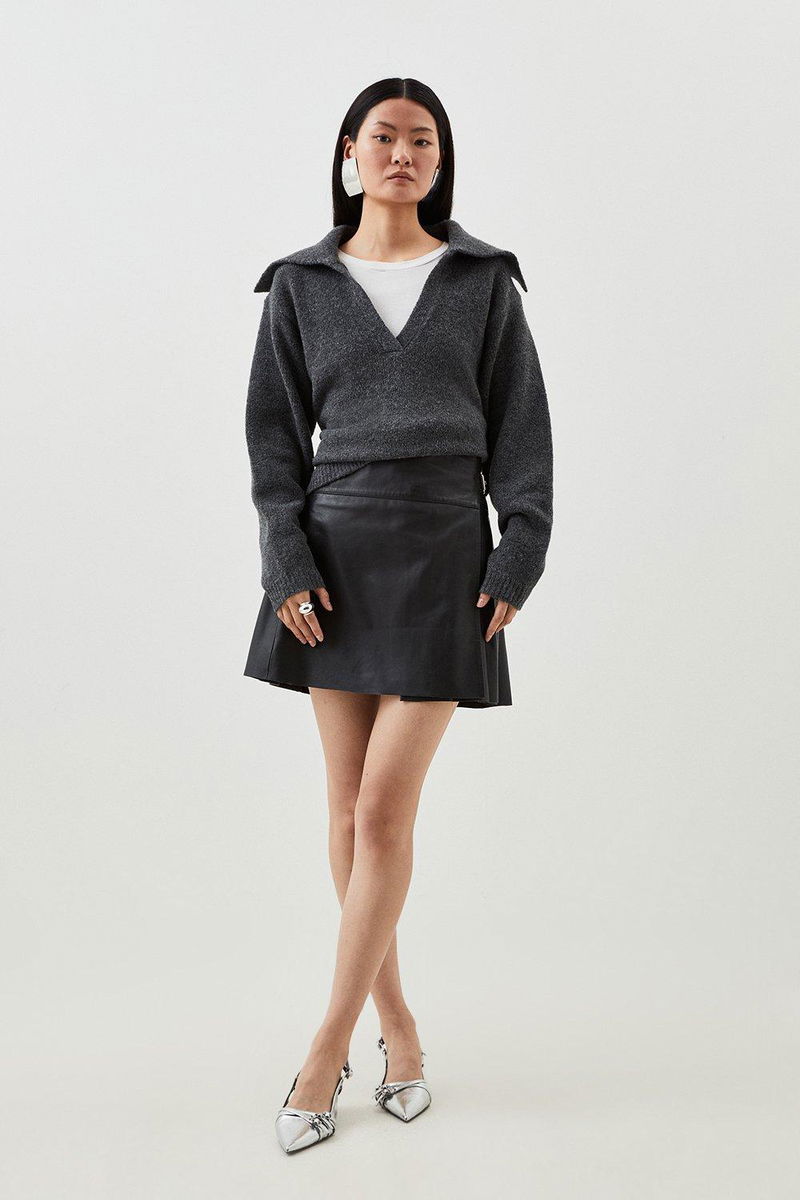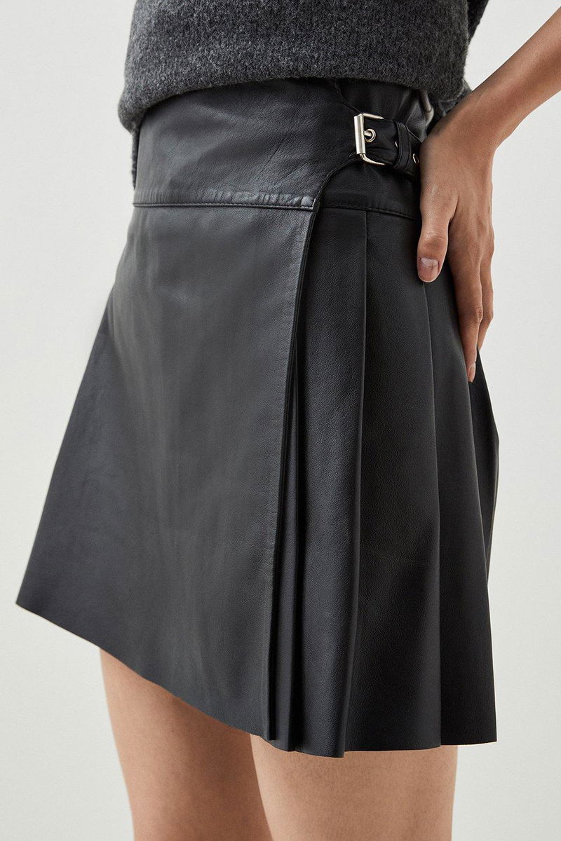 This skirt enlivens any outfit with a considered edge, crafted from buttery leather that’s cut to a playful mini length . Featuring hard-pressed pleats and a kilt style with embellished detailing that sits at the side of the waist. Pair this piece with a bodysuit and bomber jacket for a contemporary ensemble.