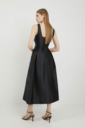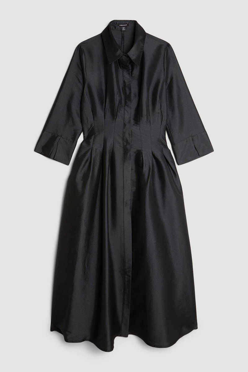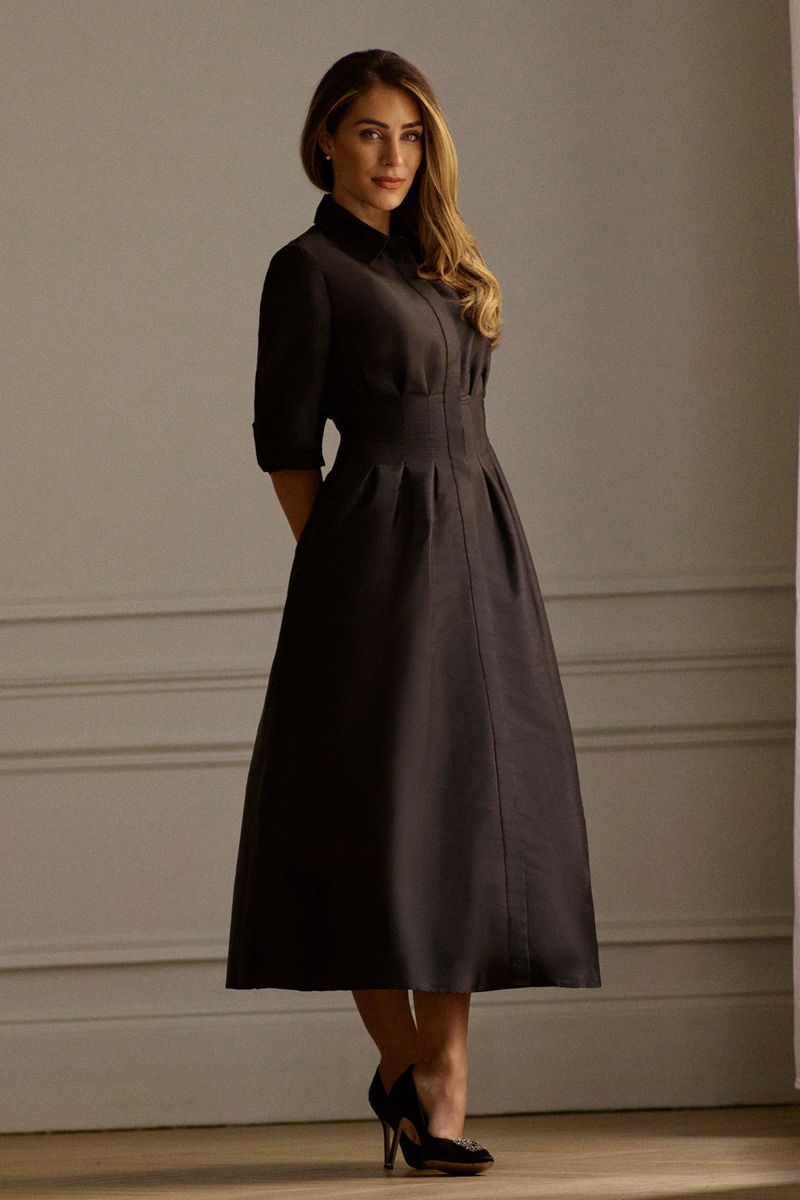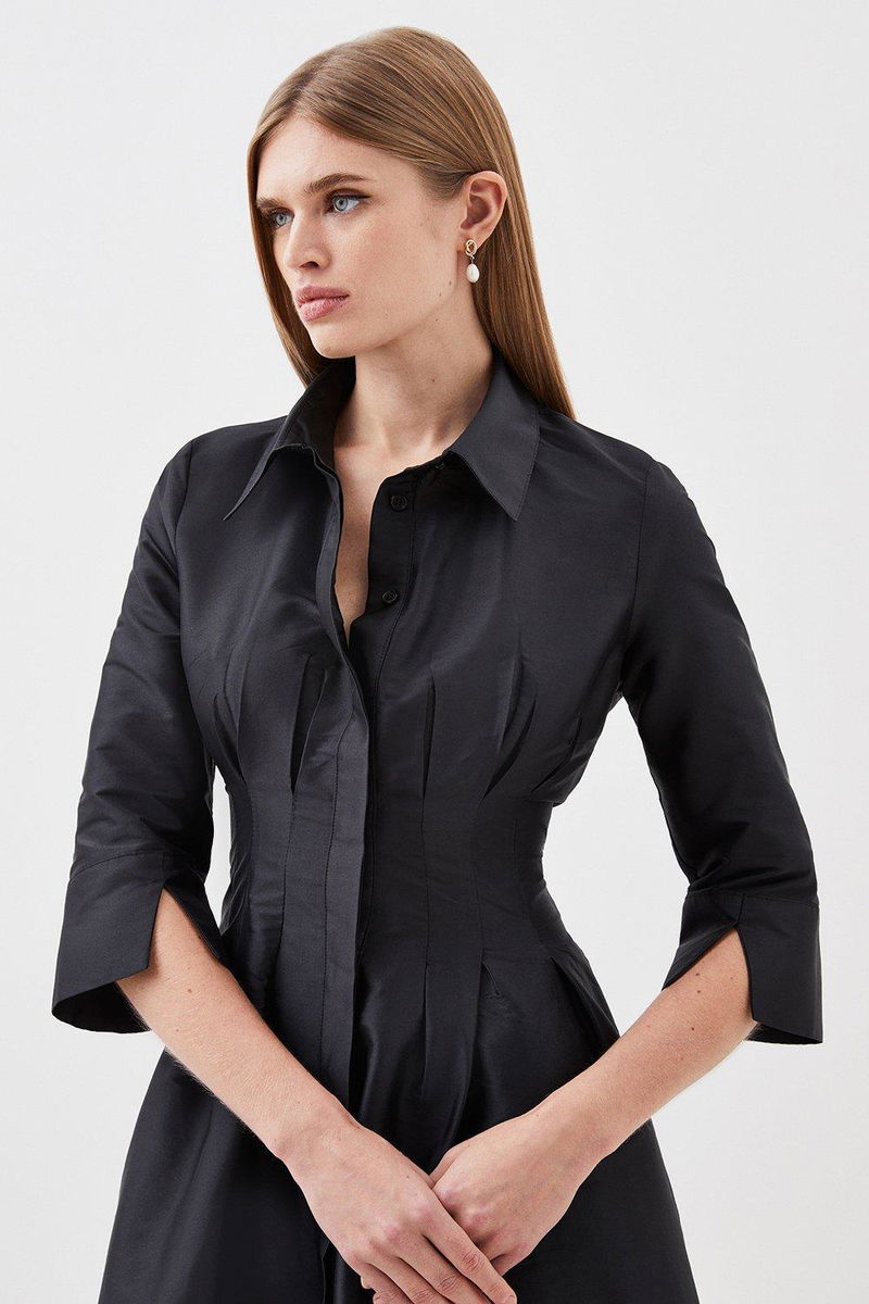 Defined by effortless elegance and timeless sophistication, the new By Lydia: Summer '24 collection captures Lydia Millen's signature style. Feel confident in our midi dress, made in taffeta fabric, featuring a darted waistline that cinches the silhouette, a formal, flowing skirt, and a shirt style bodice. Style it with court heels or ankle boots for a look perfect for office days, then wear it with heeled boots or stilettos for an evening look.