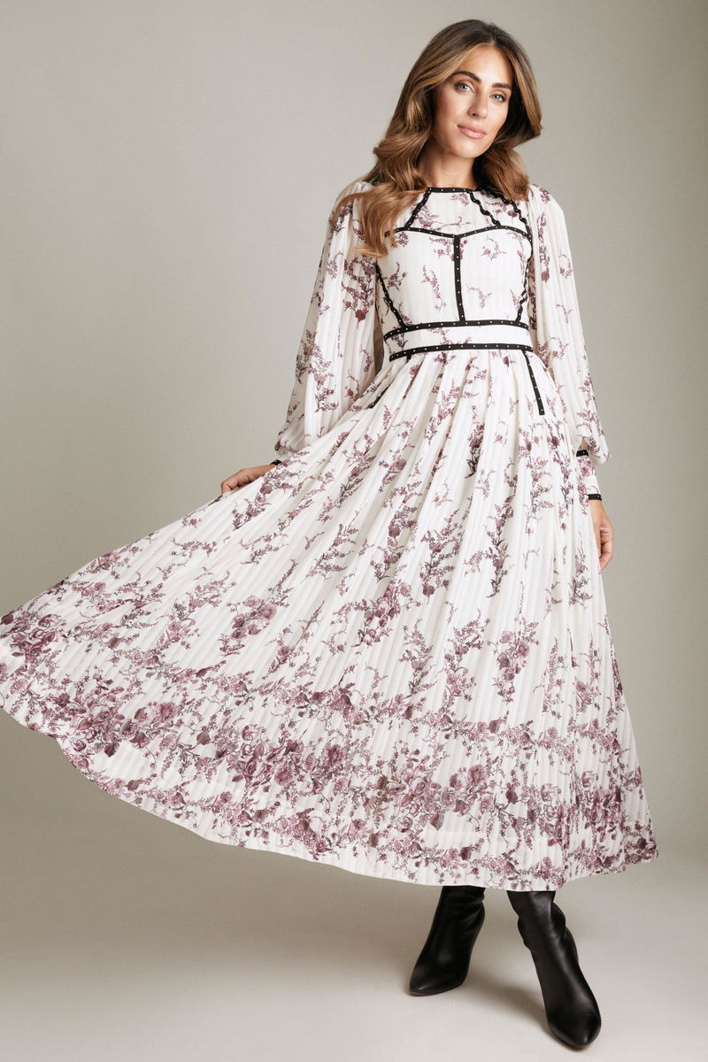 Enter an era of wardrobe wanderlust with By Lydia Winter '21: The Escapism Collection. Following a series of collaborations with fashion influencer Lydia Millen, The Escapism Collection offers an elevated, playful take on Lydias signature style. The designers have revamped the feminine floral maxi dress with Lydias signature sartorial edge in mind. Detailed with grosgrain ribbon corset taping and glossy studs, this irresistible, ankle-skimming design brings new meaning to the art of dressing up.