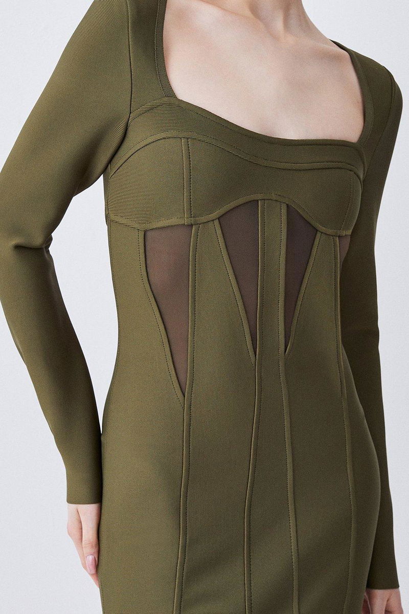 Fusing bandage detailing with mesh cut-outs, this contemporary piece smoothing sculpts the form. A square neckline adds a sultry touch which complements the front mesh details. Style this dress with stiletto heels for an after-dark look.