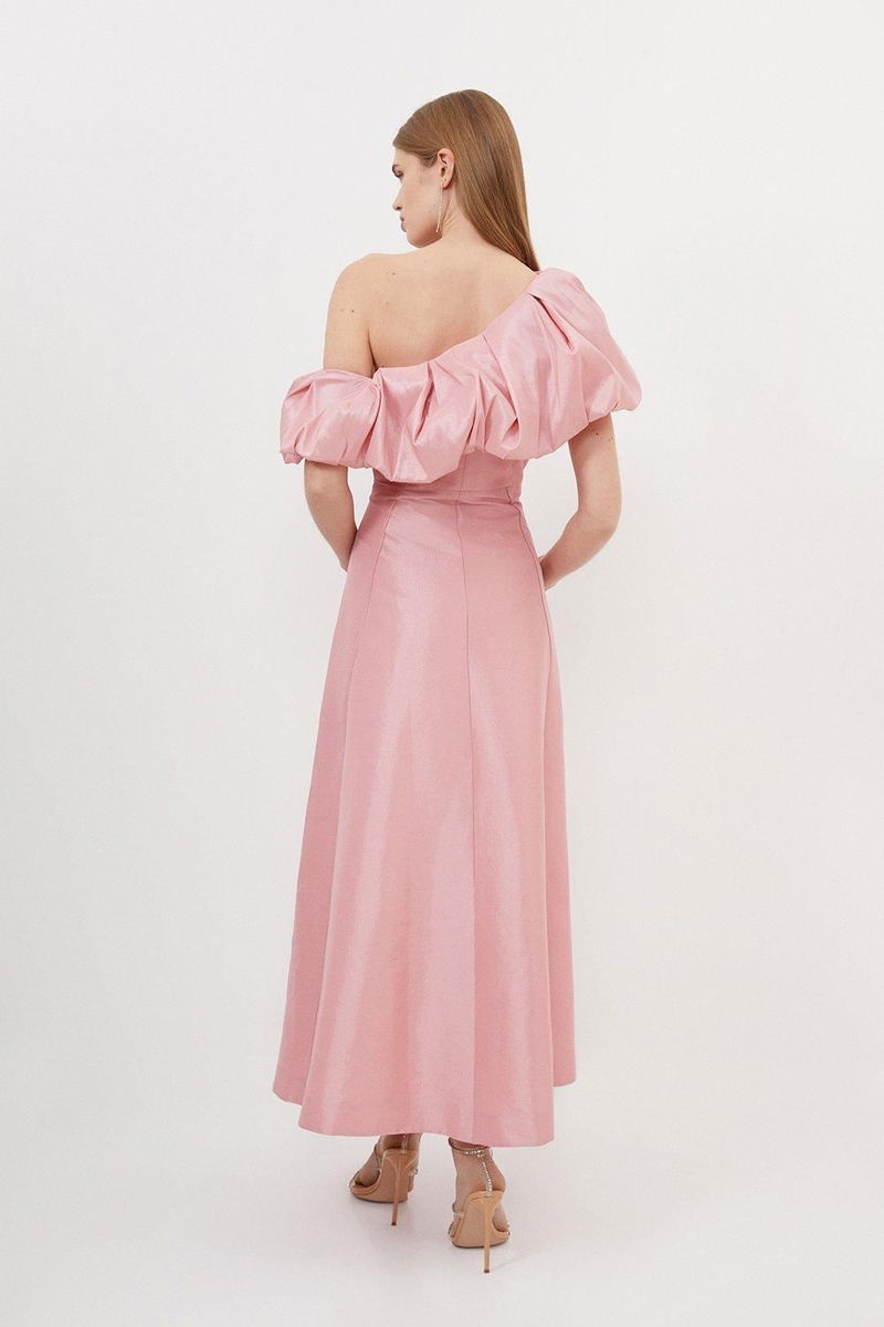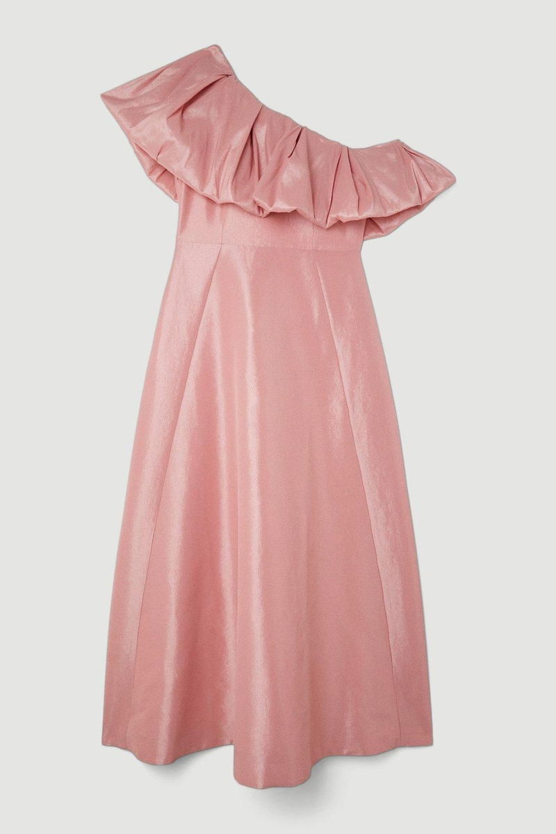Metallic Taffeta One Shoulder Ruffle Full Skirt Tailored Maxi Dress