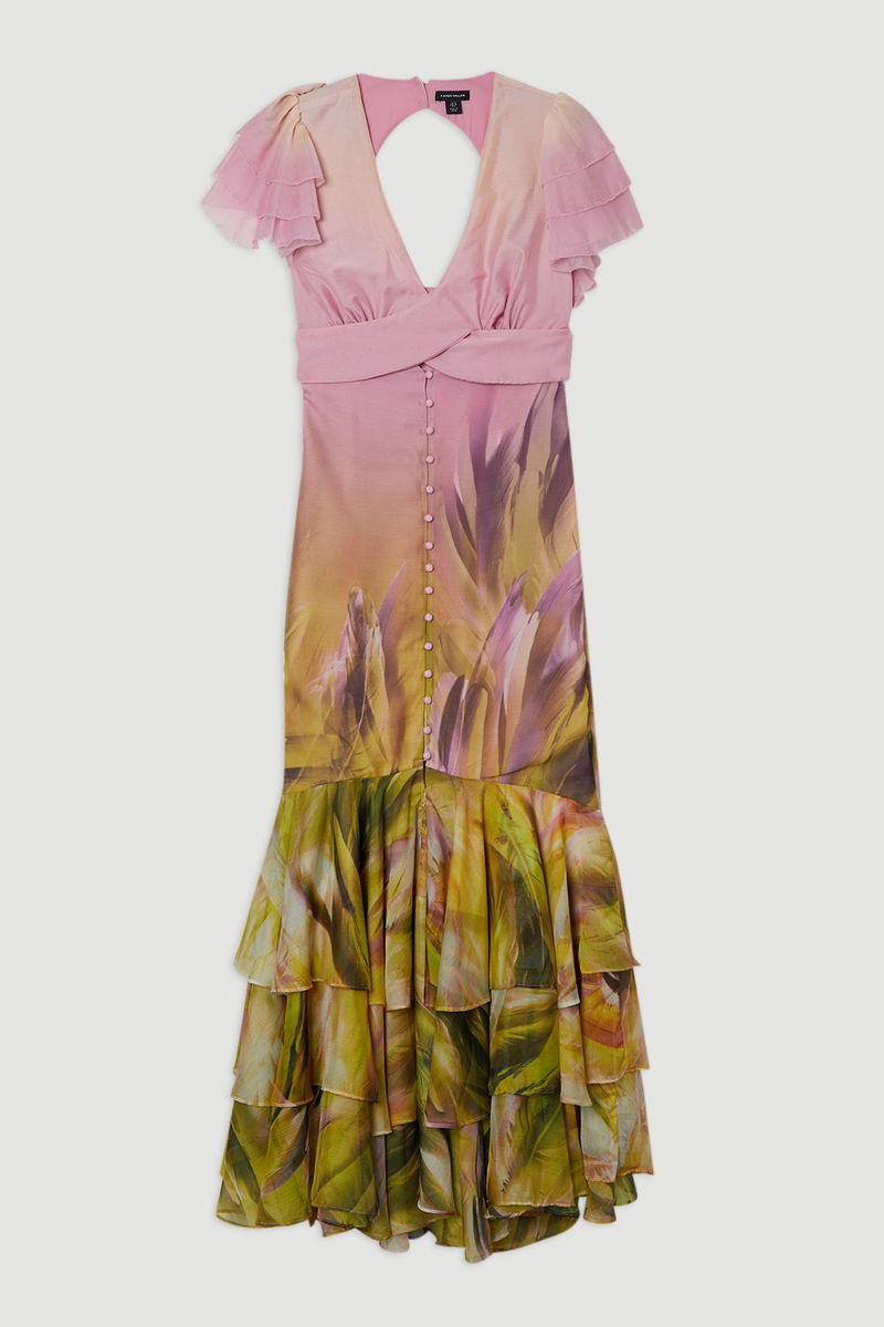 Ombre Floral Ruffle Sleeve Button Through Maxi Dress
