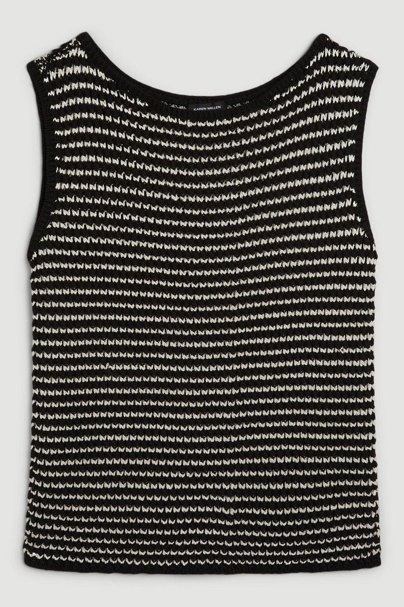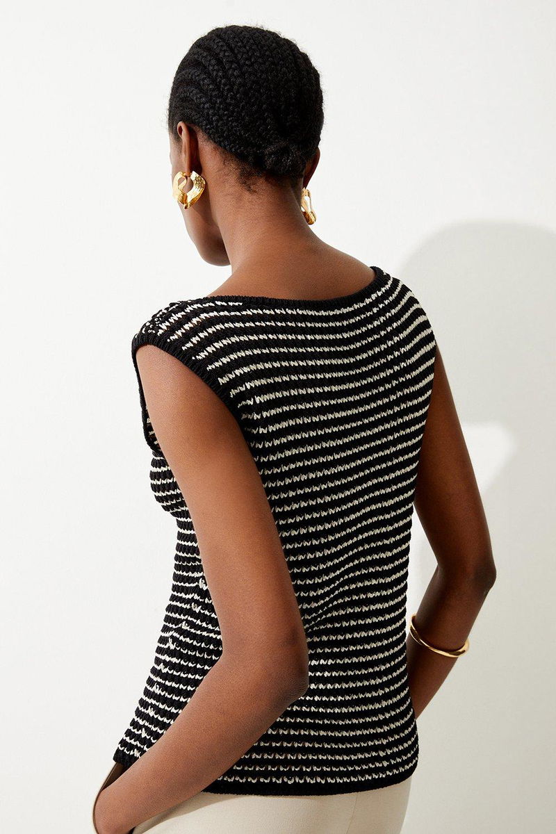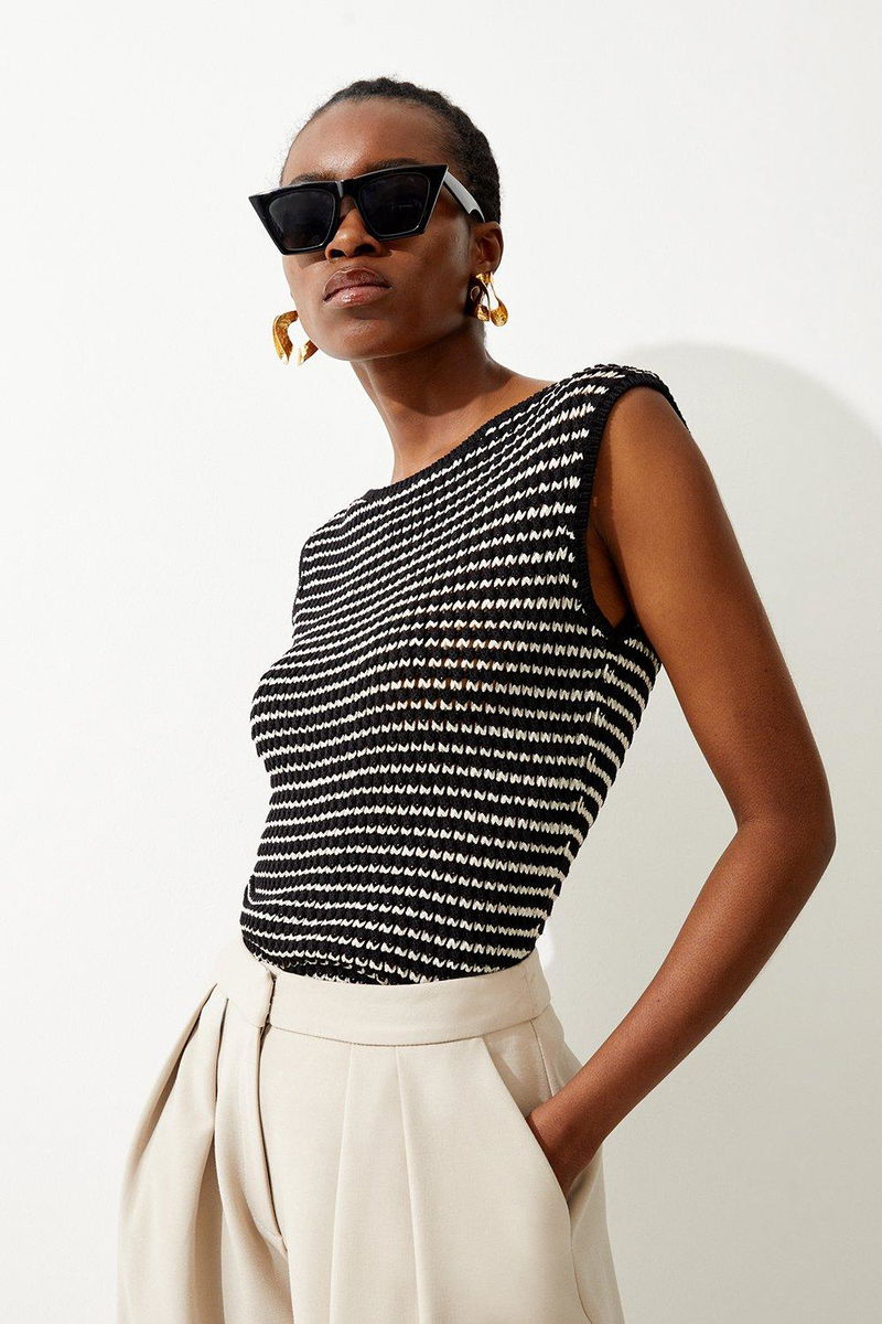 Tactile knitwear is reimagined with a summer-ready twist for this open-stitch top, appearing with a striped jacquard that adds a cosmopolitan essence when paired with tailored shorts or lightweight linen trousers. This piece is shaped with a scoop neck and drapes with a luxurious weight.