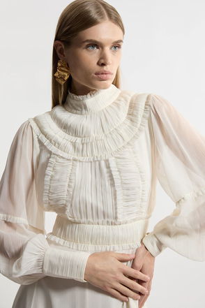 This dress is your answer to effortless styling. Cut in a loose, semi-sheer fabric, the piece features billowing sleeves and a flared drop hem. Finished off with a tie at the neck, you can craft it into an elegant bow or leave loose for a more relaxed look.