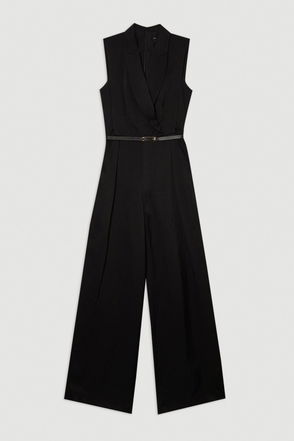Dazzle all night long in this petite jumpsuit, with a figure hugging bodice, ultra wide legs, a collar style bandeau neckline, and shimmering crystal embellishments which catch the light as you move through the night.