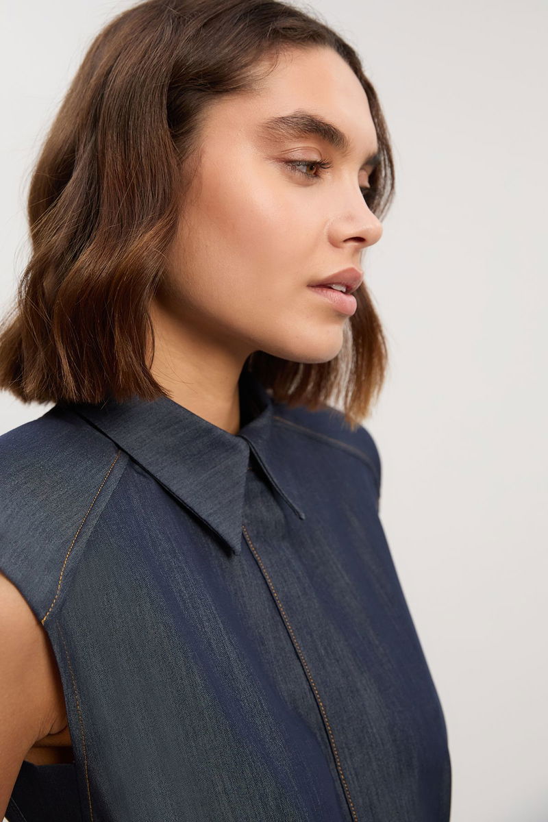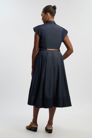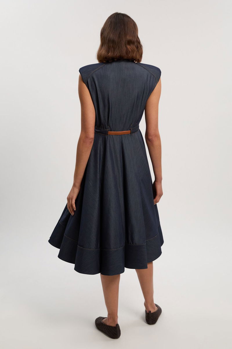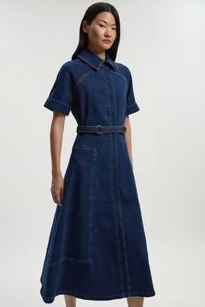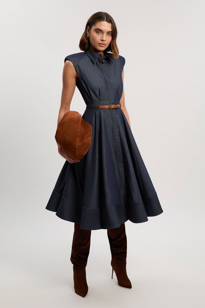 Petite Denim Tailored Belted Collared Full Midi Dress