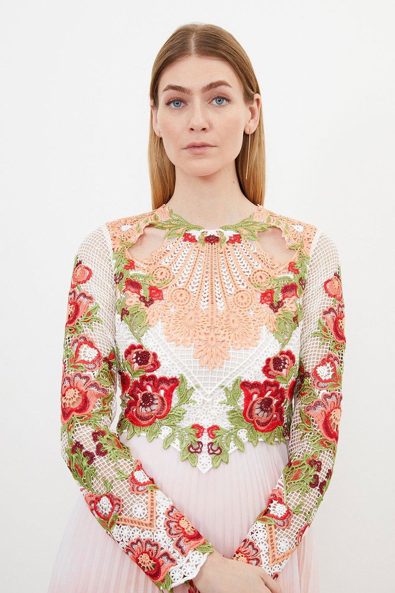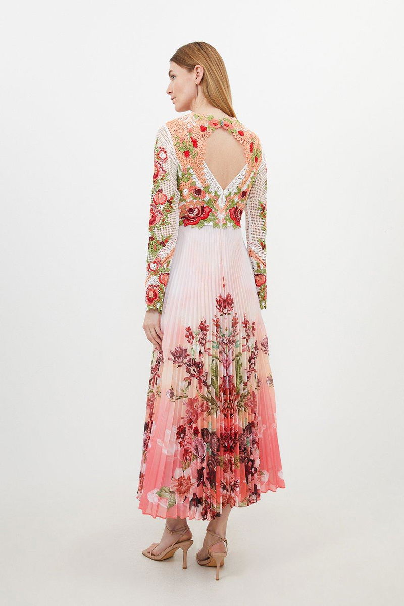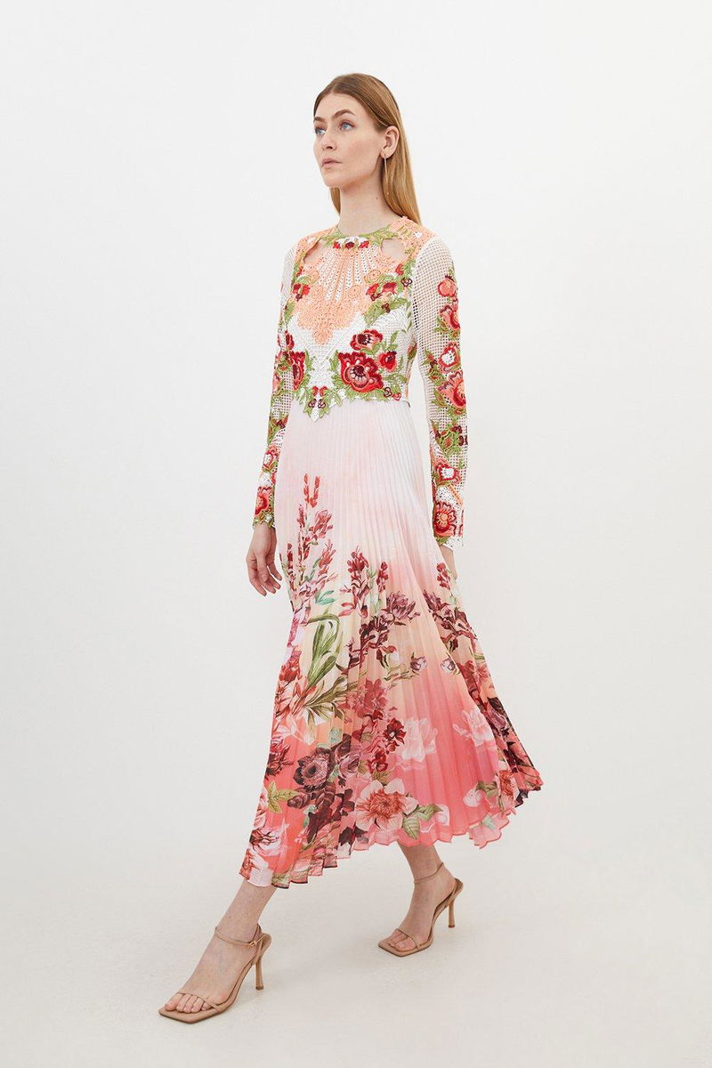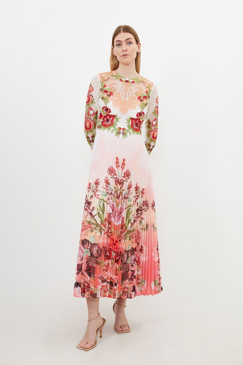 The epitome of elegance, this maxi dress is perfectly suited to special occasions. A satin skirt flows gracefully with every step, while the bodice is crafted from luxurious Guipure lace and features an array of floral motifs.